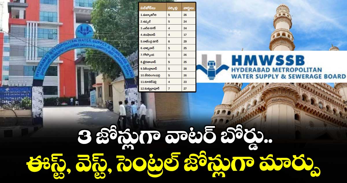 జీహెచ్ఎంసీ మాదిరిగానే పూర్తిస్థాయిలో మెట్రోవాటర్బోర్డును పునర్విభజన చేయనున్నారు. దీనికి సంబంధించి వాటర్బోర్డు ప్రత్యేక కమిటీని ఏర్పాటు చేసింది. ఈ కమిటీ నివేదిక ప్రకారం బోర్డును మూడు ప్రధాన జోన్లుగా ఏర్పాటు చేయనున్నారు. ఈస్ట్, వెస్ట్, సెంట్రల్ జోన్లుగా ఏర్పాటు చేసి ప్రధాన కార్యాలయం నుంచే పరిపాలన వ్యవహారాలను ఎండీ పర్యవేక్షణ చేయనున్నారు.