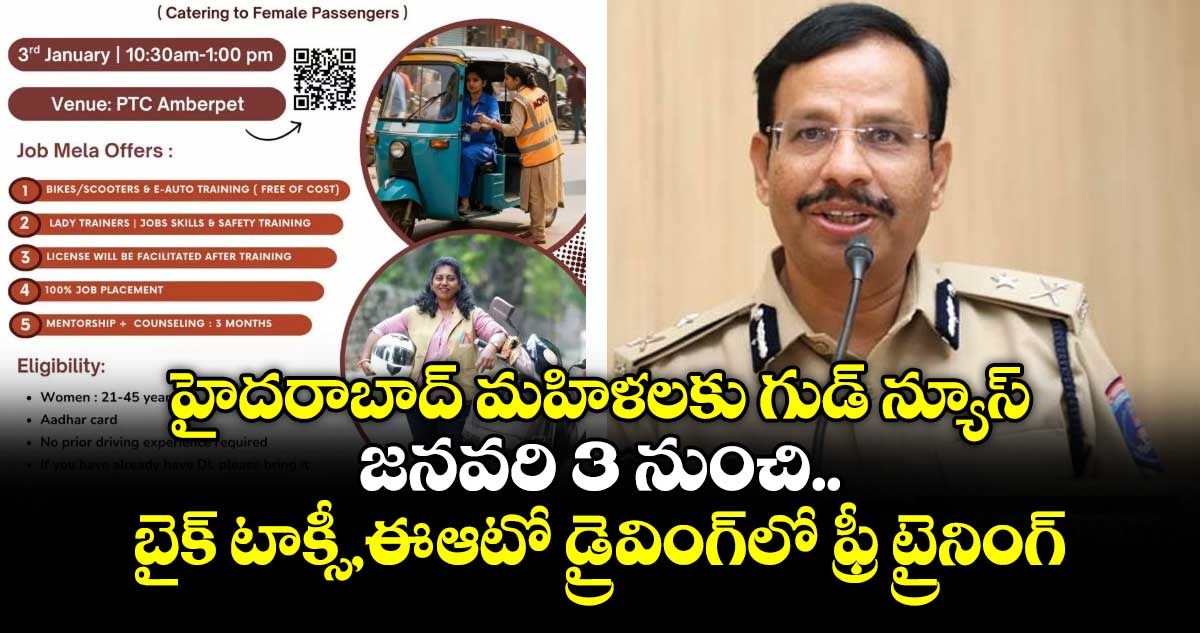 వాహన లోన్/ లీజు సౌకర్యం & ఉపాధి కల్పిస్తుంది. డ్రైవింగ్ అనుభవం లేకున్నా అప్లై చేయొచ్చు. ఏజ్ 21-45 ఏండ్ల మధ్య (హైదరాబాద్వాసులే) ఉండాలి. ఔత్సాహికు లు జనవరి 3న అంబర్పేట్ పోలీస్ ట్రైనింగ్ సెంటర్ కు వెళ్లాలి. మరిన్ని 89788 62299 సంప్రదించండి. ఆసక్తి గల మహిళలు ఈ అవ కాశాన్ని సద్వినియోగం చేసుకోగలరు 'అంటూ హైదరాబాద్ సీపీ సజ్జనార్ ట్వీట్ చేశారు.