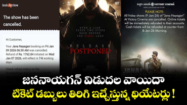 Read Moreజననాయగన్ విడుదల వాయిదా.. టికెట్ డబ్బులు తిరిగి ఇచ్చేస్తున్న థియేటర్లు !