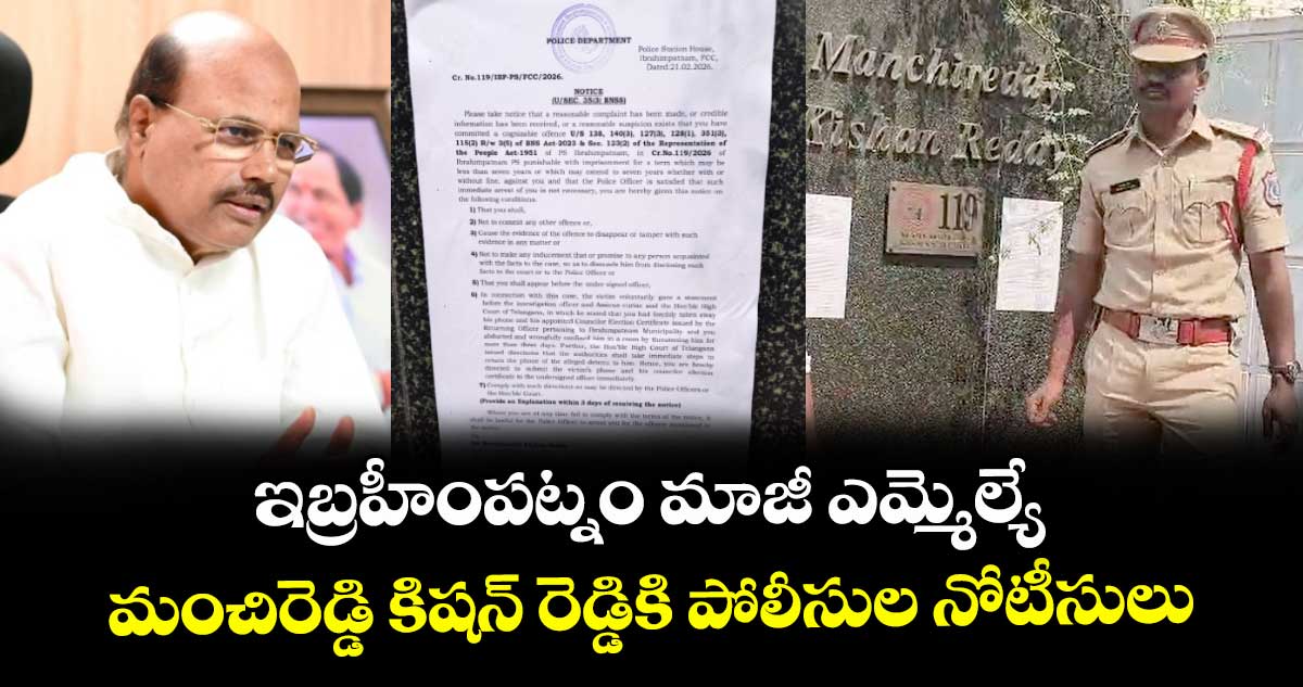 హైదరాబాద్: ఇబ్రహీంపట్నం మాజీ ఎమ్మెల్యే మంచిరెడ్డి కిషన్ రెడ్డికి, ఆయన కుమారుడు మంచిరెడ్డి ప్రశాంత్ రెడ్డికి ఇబ్రహీంపట్నం పోలీసులు నోటీసులు జారీ చేశారు. క్రైం నెంబర్ 119/2026 కింద BNSS సెక్షన్ 35(3) ప్రకారం పోలీసులు నోటీసు జారీ చేశారు. కౌన్సిలర్ ఎన్నికల సర్టిఫికేట్, మొబైల్ ఫోన్ బలవంతంగా లాక్కొని, బాధితుడిని మూడు రోజుల పాటు నిర్బంధించారని ఆరోపణలు ఉన్నాయి.
