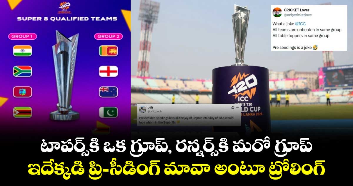 T20 World Cup: టీ20 ప్రపంచ కప్లోని సూపర్-8 ఫార్మాట్పై అంతర్జాతీయ క్రికెట్ మండలి (ఐసీసీ) ప్రస్తుతం తీవ్ర స్థాయిలో విమర్శలను ఎదుర్కొంటుంది. ప్రీ-సీడింగ్ విధానంతో టోర్నీలో అసమతుల్యత ఏర్పడిందని క్రికెట్ అభిమానులు మండిపడుతున్నారు. మరి.. ప్రీ-సీడింగ్ విధానం విషయంలో ఐసీసీపై క్రీడా వర్గాలు అసంతృప్తి, అసహనం వ్యక్తం చేయడానికి గల ప్రధాన కారణం ఇప్పుడు తెలుసుకుందాం.. సాధారణంగా ఏదైనా టోర్నమెంట్లో గ్రూప్ స్టేజ్ ముగిసిన తర్వాత పాయింట్ల పట్టికలో టాప్లో నిలిచిన టీమ్స్ ని నెక్ట్స్ రౌండ్ లో కాస్త ఉపశమనం కలిగించేలా సీడింగ్ విధానం అమలు చేస్తుంటారు. ఈసారి మాత్రం ఐసీసీ టీ20 ప్రపంచ కప్-2026 టోర్నమెంట్ ప్రారంభం కాకముందే.. ఏ టీమ్ ఏ గ్రూపులో ఉండాలో ఫిక్స్ చేసేసింది. మెగా టోర్నీ స్టార్ట్ కాకముందే సీడింగ్ చేయడంతో దీన్ని ప్రీ-సీడింగ్ అని పిలుస్తుంటారు. దీని అర్థం ఏంటంటే.. ఒక టీమ్ తన గ్రూపులో మొదటి స్థానంలో నిలిచినా, సెకండ్ ప్లేస్ లో నిలిచినా... ముందుగా అనుకున్న స్లాట్లోనే ఉంటుంది.