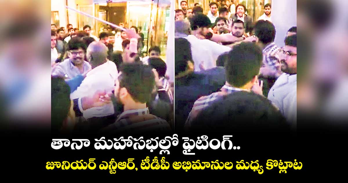 అయితే సభలో జూనియర్ ఎన్టీఆర్ అభిమానులు కొందరు ఆయన పేరును ప్రస్తావనకు తీసుకురావడంతోనే ఈ గొడవ మొదలైనట్లు తెలుస్తోంది. ఇది నచ్చని టీడీపీ మద్దతుదారులు.. జూనియర్ ఎన్టీఆర్ అభిమానులపై దాడికి దిగారని సమాచారం. టీడీపీ ఎన్ఆర్ఐ అధ్యక్షుడు కోమటి జయరాం వారిని విడదీసే ప్రయత్నం చేసినా ఎవరూ వెనక్కి తగ్గకపోవడం గమనార్హం. అందుకు సంబంధించిన వీడియోలు ప్రస్తుతం సోషల్ మీడియాలో వైరల్గా మారాయి.