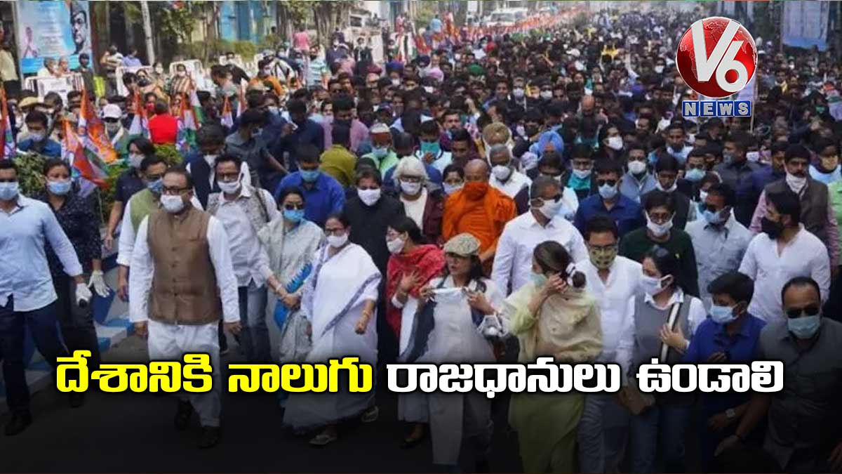 కోల్కతా: పశ్చిమ బెంగాల్ ముఖ్యమంత్రి, తృణమూల్ కాంగ్రెస్ అధినేత మమతా బెనర్జీ కేంద్రంపై విరుచుకుపడ్డారు. దేశానికి నాలుగు రాజధానులు ఉండాలంటూ సంచలన వ్యాఖ్యలు చేశారు. నేతాజీ సుభాష్ చంద్రబోస్ 125 జయంతోత్సవాల్లో భాగంగా ఆమె ఈ వ్యాఖ్యలు చేశారు. దేశానికి నాలుగు రొటేటింగ్ రాజధానులు ఉండాలని మమతా బెనర్జీ అన్నారు. అప్పట్లో కోల్కతాను రాజధానిగా చేసుకుని ఆంగ్లేయులు ఏలారని, అలాంటప్పుడు దేశంలో ఒక్క రాజధాని నగరమే ఎందుకు ఉండాలని ఆమె ప్రశ్నించారు.