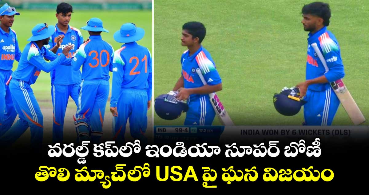 అండర్-19 వరల్డ్ కప్ లో టీమిండియా బోణీ కొట్టింది. ఆడిన తొలి మ్యాచ్ లో పసికూన యూఎస్ఏ పై ఘన విజయం సాధించింది. గురువారం (జనవరి 15) బులవాయో వేదికగా క్వీన్స్ స్పోర్ట్స్ క్లబ్ లో జరిగిన ఈ మ్యాచ్ లో 6 వికెట్ల తేడాతో గెలిచింది. టీమిండియా విజయంలో బౌలర్లు కీలక పాత్ర పోషించారు. మొదట బ్యాటింగ్ చేసిన యూఎస్ఏ కేవలం 107 పరుగులకే ఆలౌట్ అయింది. డక్ వర్త్ లూయిస్ పద్ధతిలో ఇండియా టార్గెట్ ను 37 ఓవర్లలో 96 పరుగులకు కుదించారు. ఈ లక్ష్యాన్ని ఇండియా 17.2 ఓవర్లలో 4 వికెట్లు కోల్పోయి 99 పరుగులు చేసి గెలిచింది.