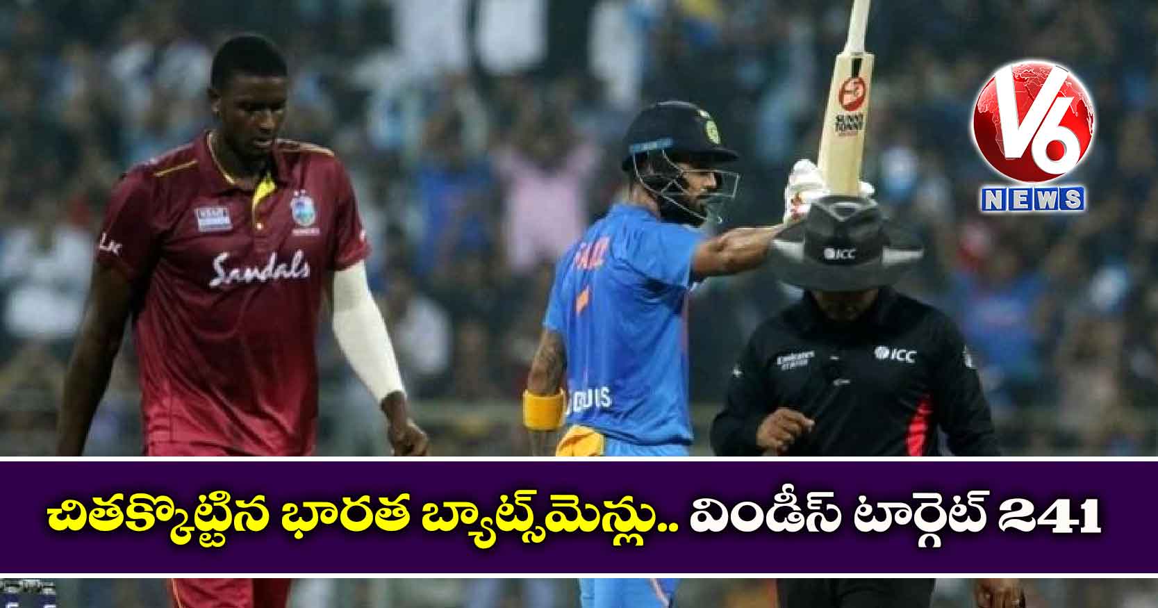 ముంబైలోని వాంఖడే స్టేడియంలో టీం ఇండియా, వెస్టిండీస్ మధ్య జరుగుతున్న మూడో టీ20 మ్యాచ్లో భారత్ జట్టు భారీ స్కోర్ చేసింది. నిర్ణీత 20 ఓవర్లలో మూడు వికెట్ల నష్టానికి 240 పరుగులు చేసింది. రోహిత్ శర్మ 34 బంతుల్లో 71 పరుగులు(6 ఫోర్లు, 5 సిక్సులు) చేసి ఔటవ్వగా.. రాహుల్ 56 బంతుల్లో 91 పరుగులు(9 ఫోర్లు, 5 సిక్సులు) చేశాడు. టీం ఇండియా కెప్టెన్ విరాట్ కోహ్లీ సిక్సులతో దుమ్ములేపాడు. 29 బంతులు ఆడిన కోహ్లీ.. 7 సిక్సులు, 4 ఫోర్లతో కలిపి 70 పరుగులు చేసి నాటౌట్గా నిలిచాడు. విండిస్ జట్టు ఈ మ్యాచ్ లో గెలవాలంటే 241 పరుగులు చేయాల్సి ఉంది.