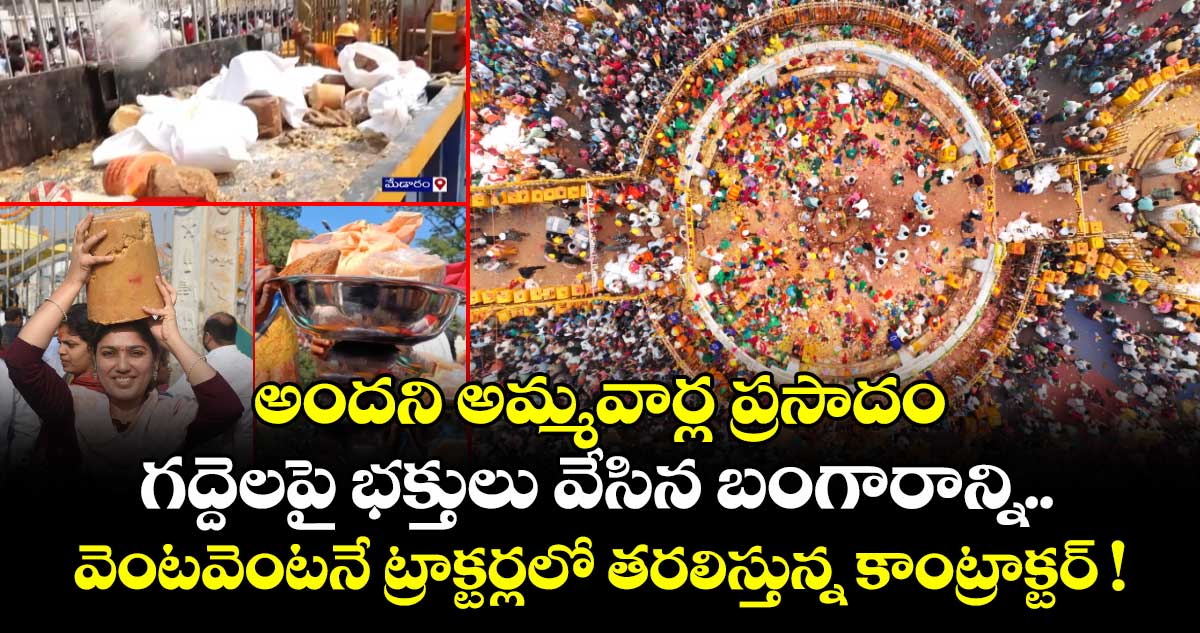 ఏటూరు నాగారం: మేడారం సమ్మక్క సారలమ్మ మహా జాతరకు వచ్చిన భక్తులకు అమ్మవార్ల ప్రసాదం అందకపోవడంతో వారు నిరాశకు గురవుతున్నారు. దర్శనానికి వచ్చే భక్తులు సమర్పించిన బంగారం (బెల్లం) కాకుండా వేరే భక్తులు అమ్మవార్లకు సమర్పించిన బంగారాన్ని ప్రసాదంగా తీసుకోవడం జాతర ఆనవాయితీ. కానీ ఈ ప్రసాదం భక్తులకు అందడం లేదు. గద్దెలపై భక్తులు వేసిన బంగారాన్ని.. కాంట్రాక్టర్ వెంటవెంటనే ట్రాక్టర్లలో బయటకు తరలిస్తున్నారు. అమ్మవార్ల ప్రసాదాన్ని ఇవ్వాలని ఎంత అడిగినా వలంటీర్లు ఇవ్వడం లేదని భక్తులు ఆవేదన వ్యక్తం చేస్తున్నారు.