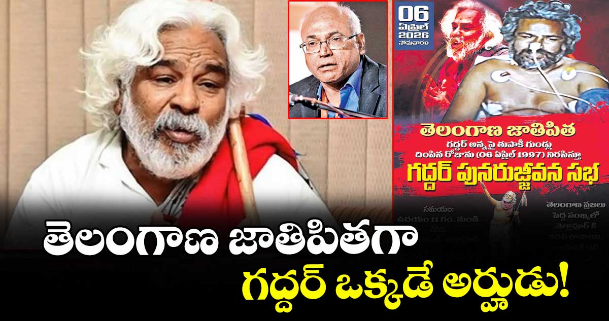 రాష్ట్రాన్ని పదేండ్లు పాలించి దోచుకున్నాడని ప్రభుత్వమే చెబుతూ కేసీఆర్కు జాతిపిత సీటును వదిలేస్తున్న దశలో.. నాడు గద్దర్ మీద చంద్రబాబు ప్రభుత్వం ఘోరంగా కాల్పులు జరిపి గద్దర్ గుండెల్లోకి ఆరుగుండ్లు దించిన ఏప్రిల్ 6 తేదీన తెలంగాణ జాతిపితగా గద్దర్ను ప్రకటిస్తూ ఆయన పునర్జీవన సభ తెల్లాపూర్ విగ్రహం వద్ద ప్రజలు జరుపుతున్నారు. అందువల్ల తెలంగాణ చరిత్రలో ఇది చాలా ముఖ్యమైన సభ. గద్దర్ కంటే మెరిట్ కలిగిన వ్యక్తి తెలంగాణలో ఈ గుర్తింపునకు ఎన్నుకోదగ్గవారు లేరు. ఇక్కడ కులం, గద్దర్తో వ్యక్తులకు, సంస్థలకు ఉన్న భిన్నాభిప్రాయాలు అడ్డు రాకూడదు.