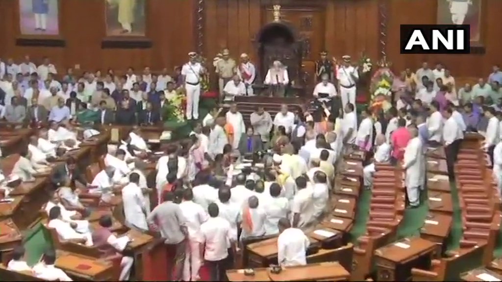 నిన్న ఓటాన్ అకౌంట్ ను ప్రవేశపెట్టేందుకు కన్నడ అసెంబ్లీ సమావేశమైంది. గవర్నర్ వజుభాయి వాలా ప్రసంగాన్ని బీజేపీ అడ్డుకుంది. ప్రసంగంలో రెండు పేజీలు మాత్రమే చదివి గవర్నర్ వెళ్లిపోయారు. ప్రసంగ ప్రతులను సభ్యులకు పంచిన స్పీకర్ కేఆర్ రమేశ్ కుమార్.. గవర్నర్ స్పీచ్ ను టేబుల్ చేసి.. కాపీలను సభ్యులకు పంచారు.