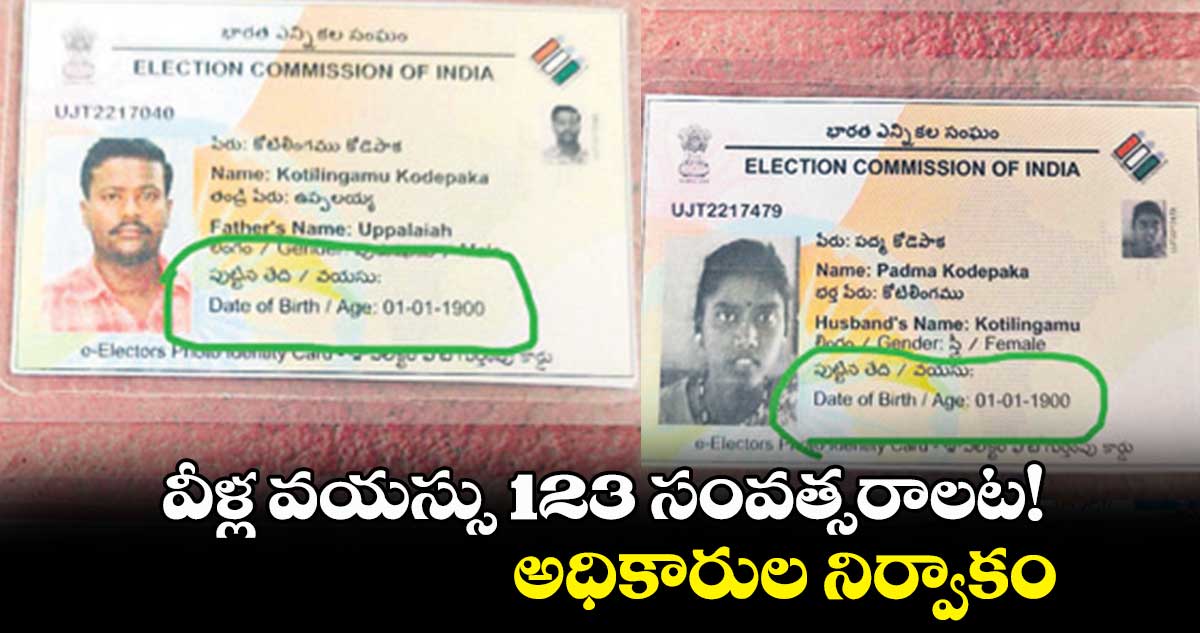 కమలాపూర్, వెలుగు: హనుమకొండ జిల్లా కమలాపూర్ మండలంలో కోడెపాక కోటిలింగాము (44), కోడెపాక పద్మ (42) దంపతులు నెల రోజుల కింద కొత్త ఓటరు కార్డు కోసం దరఖాస్తు చేసుకున్నారు. పాత కార్డు ప్రకారమే దరఖాస్తు చేసుకున్నా కొత్త కార్డులో వారి పుట్టిన సంవత్సరం 01–01–1900 గా అధికారులు నమోదు చేశారు.