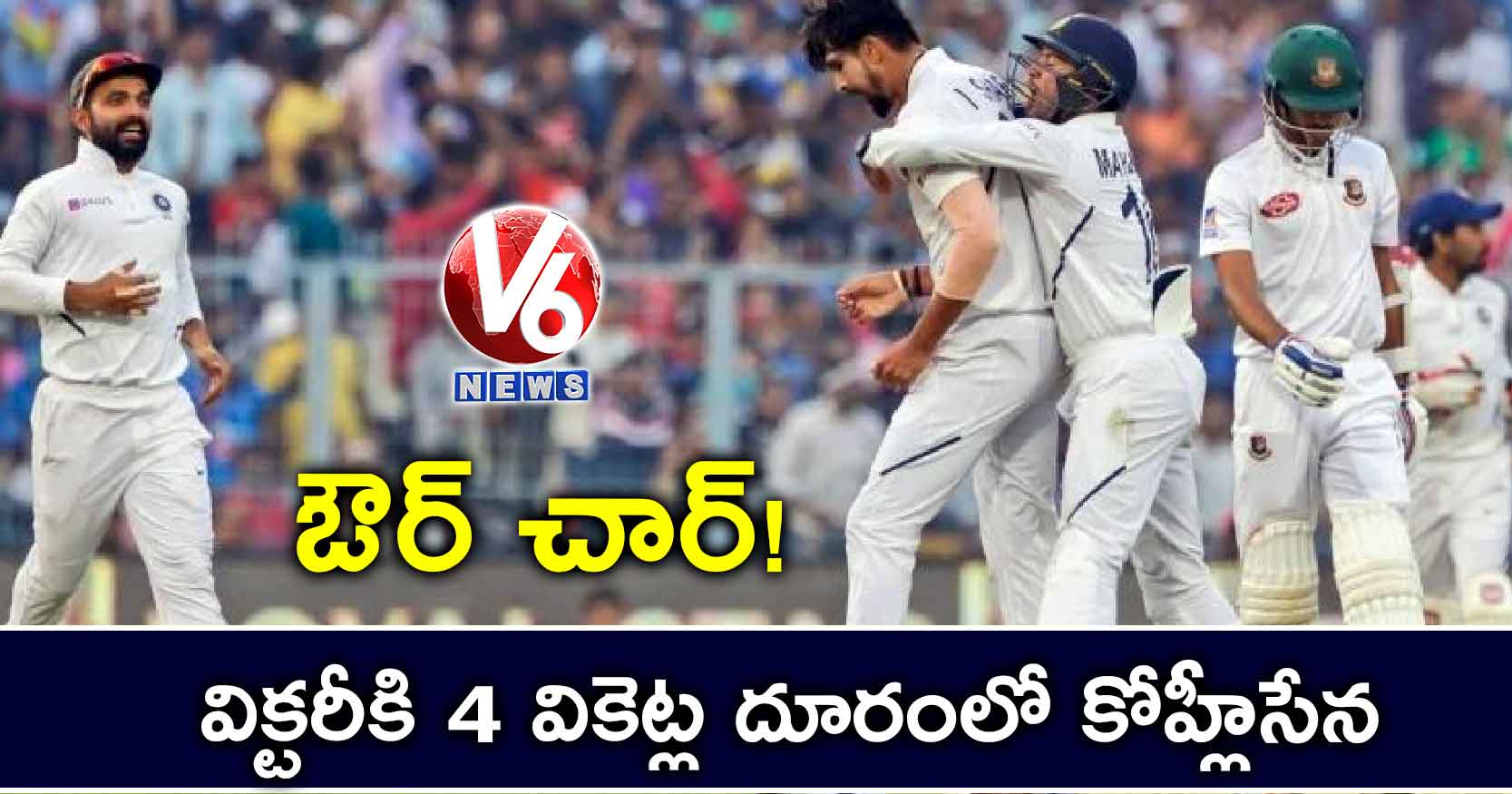 హిస్టారికల్ ‘పింక్’ విజయానికి ఇండియా చేరువైంది..! విప్లవాత్మక మార్పులో విశేషంగా రాణించింది..! మొత్తానికి అత్యంత ఆందోళన, ఉత్కంఠ రేకెత్తించిన ‘గులాబీ టెస్ట్’లో ఫస్ట్క్లాస్లో పాసయ్యేందుకు నాలుగు అడుగుల దూరంలో నిలిచింది..! డేనైట్లోనూ తన హవా జోరుగా చూపెట్టిన విరాట్ కోహ్లీ (194 బంతుల్లో 18 ఫోర్లతో 136) తొలి పింక్ సెంచరీతో డిస్టింక్షన్ సాధించగా, ‘లంబు’ ఇషాంత్ (4/39) మళ్లీ దుమ్మురేపాడు..! కళ్లముందున్న కొండంత ఆధిక్యాన్ని కరిగించే క్రమంలో పెవిలియన్కు క్యూ కట్టిన బంగ్లా బ్యాట్స్మెన్.. ఇన్నింగ్స్ ఓటమికి అతి దగ్గరలో ఉన్నారు..! ఓవరాల్గా స్వదేశంలో 12వ సిరీస్ విజయాన్ని విరాట్సేన లాంఛనమే చేసింది..!!