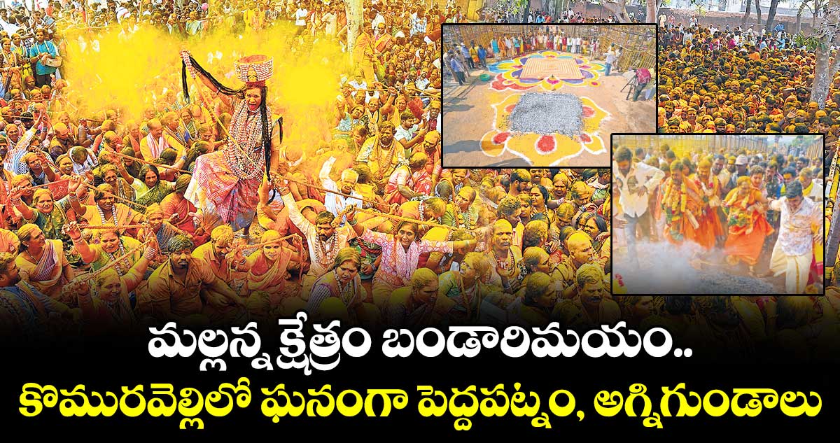 కొమురవెల్లి, వెలుగు : కొమురవెల్లి మల్లన్న బ్రహ్మోత్సవాల్లో భాగంగా పట్నం వారం (మొదటి ఆదివారం)ను పురస్కరించుకొని ఆలయ తోటబావి వద్ద పెద్దపట్నం, అగ్నిగుండాల కార్యక్రమాన్ని ఘనంగా నిర్వహించారు. ఇందులో భాగంగా ఉదయం 10 గంటల నుంచి మధ్యాహ్నం 3 గంటల వరకు హైదరాబాద్కు చెందిన మానుక పోచయ్య యాదవ్ కుటుంబ సభ్యులు, దుర్గాప్రసాద్ యాదవ్, యాదవ సంఘం సభ్యులు, ఈవో వెంకటేశ్, ఆలయ చైర్మన్ నర్సింహారెడ్డి, శివసత్తులు, భక్తుల ఆధ్వర్యంలో 25 వరుసల పెద్దపట్నం వేశారు. అనంతరం సమిధలు కాల్చి అగ్నిగుండాలు నిర్వహించారు. అర్చకులు మహాదేవుని మల్లికార్జున్తో పాటు ఆలయ సిబ్బంది స్వామి వారి ఉత్సవ విగ్రహాలను గర్భగుడి నుంచి ఊరేగింపుగా పెద్దపట్నం వద్దకు తీసుకొచ్చి కల్యాణం జరిపించారు. అనంతరం అర్చకులు ఉత్సవ విగ్రహాలతో పెద్దపట్నం, అగ్నిగుండాలు దాటారు. తోటబావి వద్ద భక్తులు పసుపు చల్లుకోవడంతో ఆలయ ప్రాంగణం, రాజగోపురం మొత్తం బండారిమయమైంది. అనంతరం ఆలయ ఆఫీసర్లు హైదరబాద్కు చెందిన యాదవ భక్తులకు, శివసత్తులకు కొత్త బట్టలు పెట్టి, బండారు పంపిణీ చేశారు.