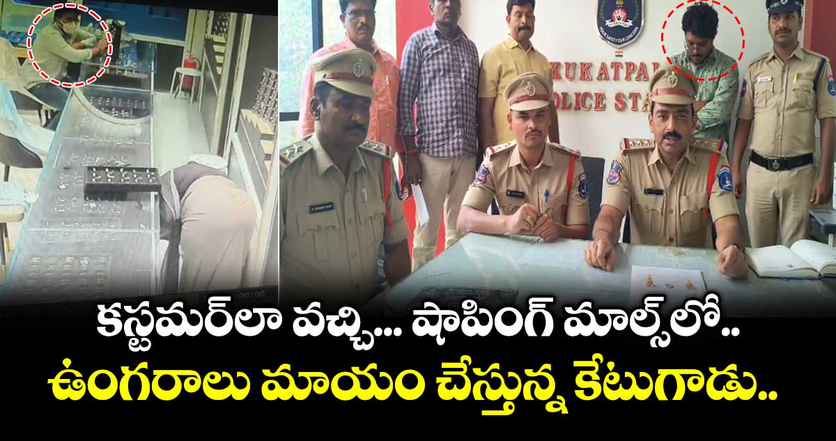 బీరంగూడకు చెందిన సాగర్ (30) అనే వ్యక్తి కూకట్పల్లిలోని సీఎంఆర్, మలబార్ గోల్డ్, పంజాగుట్టలోని సీఎంఆర్ మాల్స్ ను లక్ష్యంగా చేసుకున్నాడు. షాపింగ్ మాళ్లలో సిబ్బంది దృష్టి మళ్లించి బంగారు ఉంగరాలను దొంగిలిస్తున్నాడు. కస్టమర్లా వెళ్లి సేల్స్ ప్రతినిధులు ఉంగరాలు చూపిస్తున్న సమయంలో తన దగ్గర ఉన్న నకిలీ ఉంగరాలను ట్రేలో పెట్టి అసలు బంగారు ఉంగరాలను దొంగిలిస్తున్నాడు. వరుస ఫిర్యాదులతో రంగంలోకి దిగిన కూకట్పల్లి క్రైమ్ టీమ్, సీసీటీవీ ఫుటేజీలు, సాంకేతిక ఆధారాలతో నిందితుడిని గుర్తించి అరెస్ట్ చేశారు. అతని దగ్గరి నుంచి సుమారు 32 గ్రాముల బరువున్న మూడు బంగారు ఉంగరాలను స్వాధీనం చేసుకున్నారు పోలీసులు.