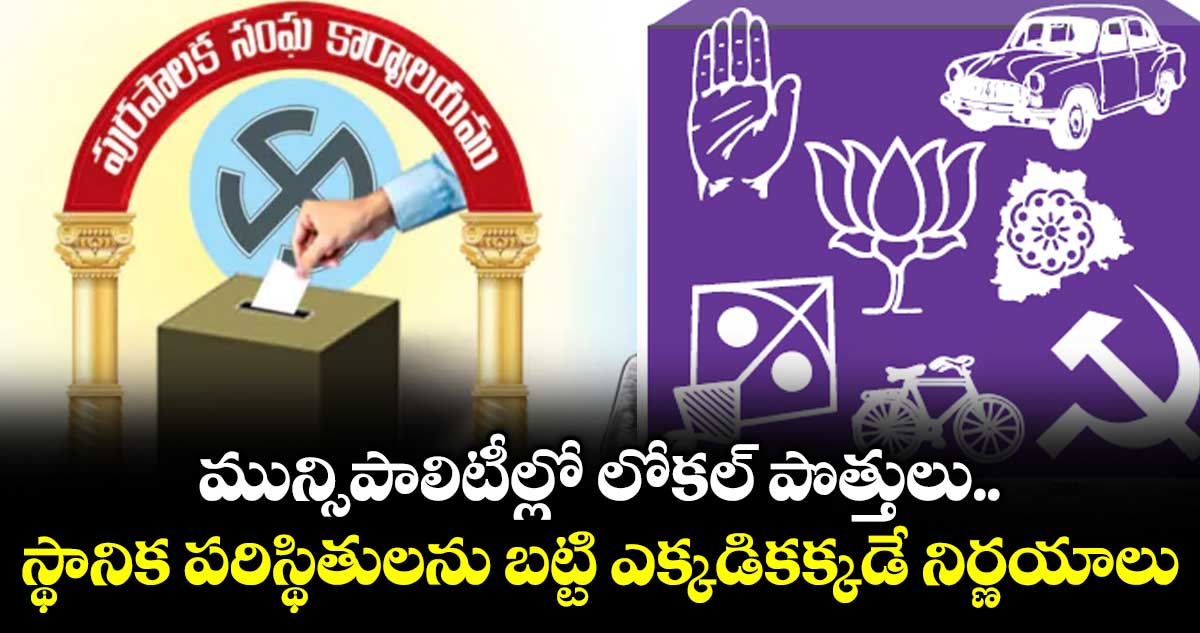 వెలుగు, నెట్వర్క్: మున్సిపల్ ఎన్నికల్లో ‘లోకల్’ పొత్తులు పొడుస్తున్నాయి. హైకమాండ్స్థాయిలో పొత్తులపై ఎటూ తేల్చని ప్రధాన పార్టీలు.. ఆయా కార్పొరేషన్లు, మున్సిపాలిటీల్లో స్థానిక పరిస్థితులను బట్టి ఎక్కడికక్కడ పొత్తులపై నిర్ణయం తీసుకుంటున్నాయి. అధికార పార్టీ కొన్నిచోట్ల సీపీఐతో, ఇంకొన్ని చోట్ల సీపీఎంతో జట్టుకడ్తోంటే, బీఆర్ఎస్ కొన్నిచోట్ల బీజేపీతో, ఇంకొన్నిచోట్ల సీపీఎం, టీడీపీతో పొత్తులు పెట్టుకుంటోంది. కాగా, ఈసారి ఒంటరిపోరుకు సిద్ధమవుతున్న మజ్లిస్.. ముస్లిం మైనారిటీల ప్రభావం ఎక్కువగా ఉన్న కరీంనగర్, నిజామాబాద్ కార్పొరేషన్లతో పాటు బోధన్, భైంసా లాంటి మున్సిపాలిటీలపై కన్నేసింది.