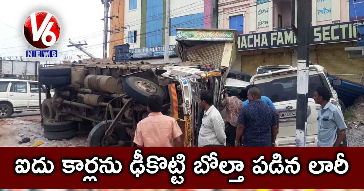 రంగారెడ్డి జిల్లా అబ్దుల్లాపూర్ మెట్ రామోజీ ఫిల్మ్ సిటీ సమీపంలో ఉదయం లారీ బీభత్సం సృష్టించింది. అదుపుతప్పి రోడ్డు పక్కన 5 కార్లును ఢీ కొట్టింది.తర్వాత ఓ పాన్ డబ్బాలోకి దూసుకెళ్లి బోల్తా పడింది. . ఈ ఘటనలో మూడు కార్లు పూర్తిగా ధ్వంసం కాగా, మరో రెండు పాక్షికంగా దెబ్బతిన్నాయి. ఆ సమయంలో కార్లలో ఎవరూ లేకపోవడంతో ప్రాణపాయం తప్పింది. ప్రమాదం జరగగానే లారీని విడిచిపెట్టి డ్రైవర్ పరారయ్యాడు.