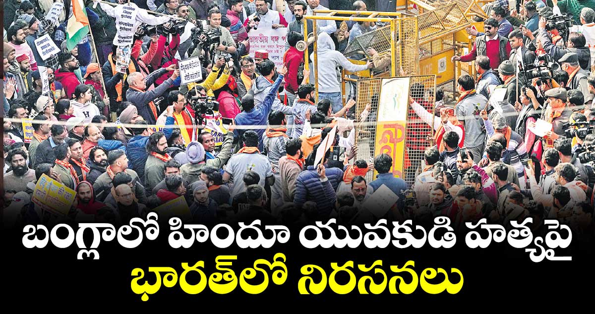 న్యూఢిల్లీ: బంగ్లాదేశ్లో హిందూ యువకుడి హత్య, హిందువులపై దాడిని ఖండిస్తూ ఢిల్లీలో నిరసనలు మిన్నంటాయి. బంగ్లాదేశ్ హైకమిషన్ వద్ద విశ్వహిందూ పరిషత్, బజరంగ్ దళ్ కార్యకర్తలు భారీ నిరసన చేపట్టారు. బంగ్లాదేశ్ ప్రభుత్వానికి వ్యతిరేకంగా నినాదాలు చేశారు. ‘భారత్ మాతా కీ జై’, ‘యూనస్ సర్కార్ హోష్ మే ఆవో’ (యూనస్ సర్కారు మేల్కోవాలి)’, ‘హిందువుల హత్యలు ఆపండి’ అంటూ నినదించారు.