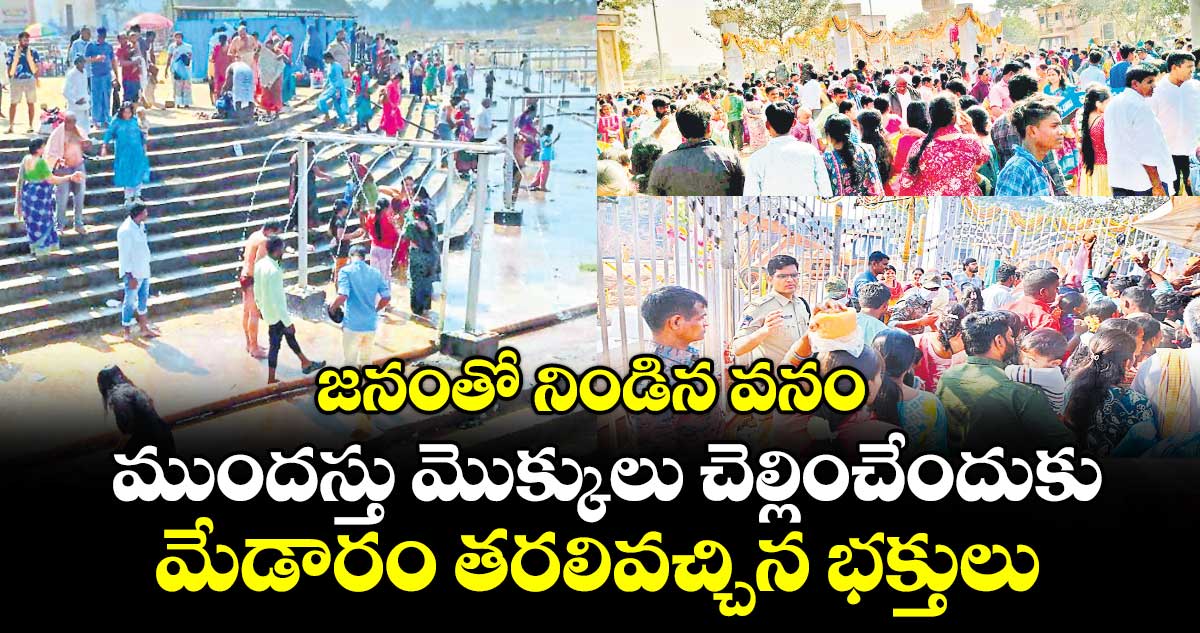 తాడ్వాయి, వెలుగు : ములుగు జిల్లా మేడారం ఆదివారం భక్తులతో కిక్కిరిసిపోయింది. సమ్మక్క, సారలమ్మను దర్శించుకొని, ముందస్తు మొక్కులు చెల్లించుకునేందుకు భక్తులు భారీ సంఖ్యలో తరలివచ్చారు. రెండు తెలుగు రాష్ట్రాలతో పాటు ఛత్తీస్గఢ్, మహారాష్ట్ర నుంచి వేల సంఖ్యలో భక్తులు మేడారం చేరుకున్నారు. జంపన్నవాగులో పుణ్యస్నానాలు ఆచరించిన అనంతరం అమ్మవార్లను దర్శించుకొని ఎత్తు బంగారం, ఒడిబియ్యం సమర్పించి మొక్కులు చెల్లించుకున్నారు.