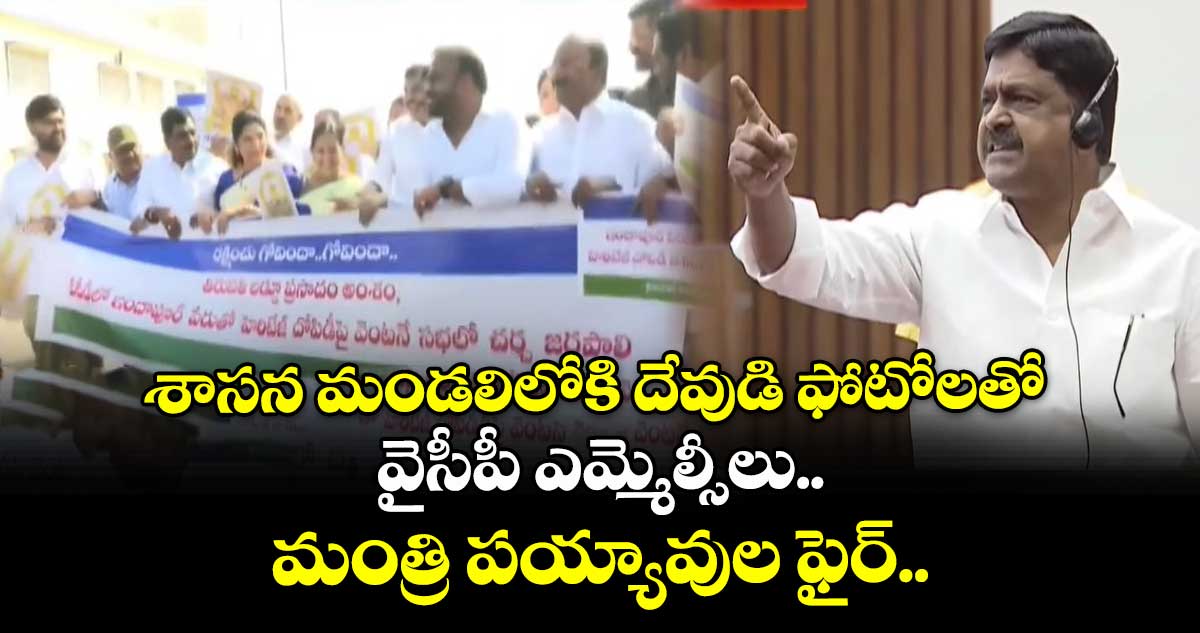 ఏపీ శాసనమండలిలో తిరుమల కల్తీ నెయ్యి అంశం ప్రకంపనలు సృష్టిస్తోంది. సెషన్స్ మొదలైన రోజు నుంచి తిరుమల కల్తీ నెయ్యి అంశంపై చర్చకు పట్టుబడుతోంది ప్రతిపక్ష వైసీపీ. ఈ అంశంపై ప్రభుత్వం వైఖరికి నిరసనగా పలు మార్లు సభ నుంచి వాకౌట్ చేశారు వైసీపీ సభ్యులు. శుక్రవారం ( ఫిబ్రవరి 20 ) సభలో మరోసారి గందరగోళం నెలకొంది. వైసీపీ ఎమ్మెల్సీలు సభలోకి దేవుడి ఫోటోలు తీసుకురావడంతో సభ హీటెక్కింది. వెంకటేశ్వర స్వామి ఫోటోలతో.. గోవిందా గోవిందా అంటూ నినాదాలు చేస్తూ సభలోకి వచ్చారు వైసీపీ సభ్యులు. వైసీపీ ఎమ్మెల్సీలపై తీవ్ర స్థాయిలో మండిపడ్డారు మంత్రి పయ్యావుల కేశవ్.