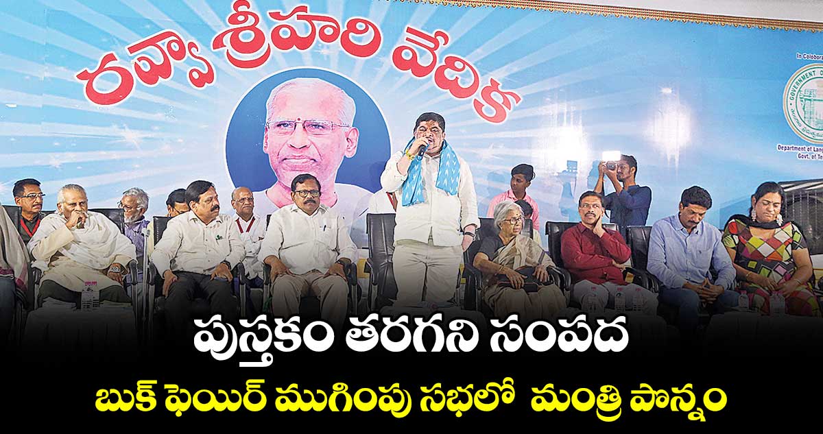 ముషీరాబాద్,వెలుగు: పుస్తకం తరగని సంపద అని.. మేథో సంపత్తికి ఎంతో దోహదపడుతుందని మంత్రి పొన్నం ప్రభాకర్ అభిప్రాయపడ్డారు. నేటితరం పిల్లలు సెల్ ఫోన్ లో ముగినిపోతూ.. పుస్తకాలు చదవడం మర్చిపోతున్నారని, తల్లిదండ్రులు పుస్తక పఠనం అలవాటు చేయించాలని సూచించారు. ఎన్టీఆర్ స్టేడియంలో పది రోజులపాటు కొనసాగిన బుక్ ఫెయిర్ సోమవారం ముగింపు సభకు ముఖ్య అతిథిగా మంత్రి హాజరై మాట్లాడారు.