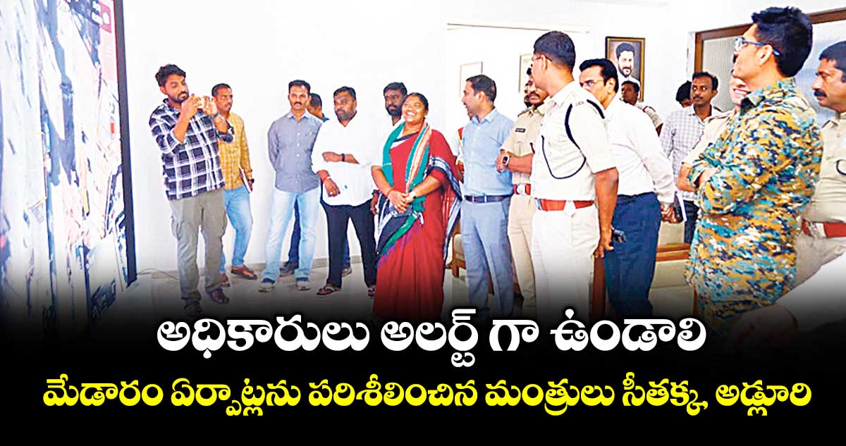 తాడ్వాయి, వెలుగు: ముఖ్యమంత్రి రేవంత్ రెడ్డి రెండు రోజుల మేడారం పర్యటన నేపథ్యంలో శనివారం మంత్రులు సీతక్క, అడ్లూరి లక్ష్మణ్ కుమార్ ఏర్పాట్లను పరిశీలించారు. ఈ సందర్భంగా మంత్రి సీతక్క మాట్లాడుతూ వనదేవతల సన్నిధిలో జరిగే క్యాబినెట్ మీటింగ్ చరిత్రలో నిలిచిపోతుందని పేర్కొన్నారు. సీఎం పర్యటన సందర్భంగా అధికారులు అలర్ట్ గా ఉండాలని, ఆలయ ప్రాంగణ పనులను వేగంగా పూర్తి చేసేలా చూడాలన్నారు. మంత్రి అడ్లూరి లక్ష్మణ్ కుమార్ మాట్లాడుతూ అధికారులు సమన్వయంతో పనిచేస్తూ అన్ని ఏర్పాట్లు పూర్తి చేయాలని సూచించారు. అనంతరం కమాండ్ కంట్రోల్ సెంటర్ ను పరిశీలించారు. జాతర సందర్భంగా 450 సీసీ కెమెరాలు ఏర్పాటు చేసినట్లు, కట్టుదిట్టమైన భద్రత కొనసాగిస్తున్నట్లు ఎస్పీ రామ్ నాథ్ కేకన్ వివరించారు. కలెక్టర్ దివాకర టీ ఎస్, భూపాలపల్లి ఎస్పీ సిరిశెట్టి సంకీర్త్, ఓఎస్ డీ శివం ఉపాధ్యాయ, ఏటూరు నాగారం ఏఎస్పీ మనన్ బట్, ములుగు మార్కెట్ కమిటీ చైర్మన్ రేగ కల్యాణి, మేడారం ట్రస్ట్ బోర్డ్ చైర్ పర్సన్ ఇర్పా సుకన్య సునీల్ ఉన్నారు.