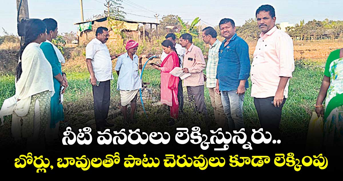 చెరువులు, కుంటలు బావులు, బోర్ల నీటిని వ్యవసాయం కోసమతే.. సీజన్ల వారీగా ఏఏ పంటలు పండిస్తున్నారో కూడా నమోదు చేస్తున్నారు. చేపల పెంపకానికి చెరువులు ఉపయోగిస్తే అవే వివరాలను నమోదు చేస్తున్నారు. అయితే బోర్లకు సంబంధించి భూగర్భ జలమట్టాల ఆధారంగా లెక్కిస్తారు. ఈ సర్వేలో చెరువులు, బోర్లు, బావుల తవ్వకం ఎప్పుడు జరిగింది. వాటి విలువతో పాటు అవి ఉన్న సర్వే నెంబర్, బై నెంబర్లు, ఖాళీ ప్లాట్లలో ఉంటే రిజిస్ట్రేషన్ నెంబర్లు పేర్కొంటూ ఓనర్ల పేర్లు కూడా నమోదు చేస్తున్నారు.