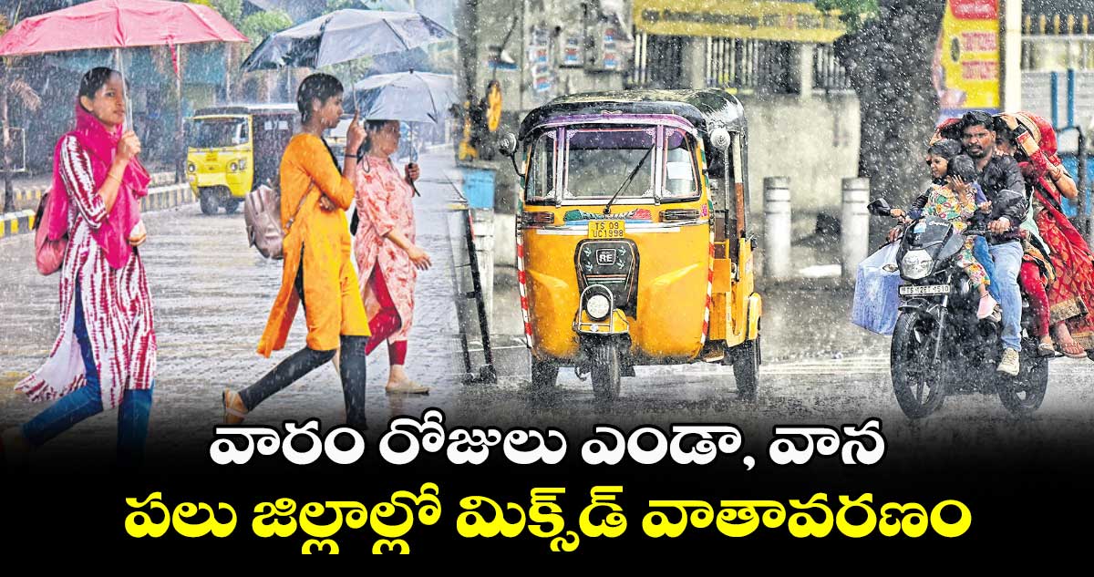 హైదరాబాద్, వెలుగు: రాష్ట్రంలో రాబోయే వారం రోజుల పాటు మిక్స్డ్ వెదర్ ఉంటుందని హైదరాబాద్ వాతావరణ కేంద్రం ప్రకటించింది. కొన్ని జిల్లాల్లో ఎండలు, మరికొన్ని జిల్లాల్లో వానలు ఉంటాయని తెలిపింది. మంగళవారం నుంచి ఆదివారం వరకు ఆరు రోజుల పాటు రాష్ట్రంలోని పలు ప్రాంతాల్లో తేలిక పాటి నుంచి మోస్తారు వర్షాలు కురిసే అవకాశం ఉందని వెల్లడించింది.