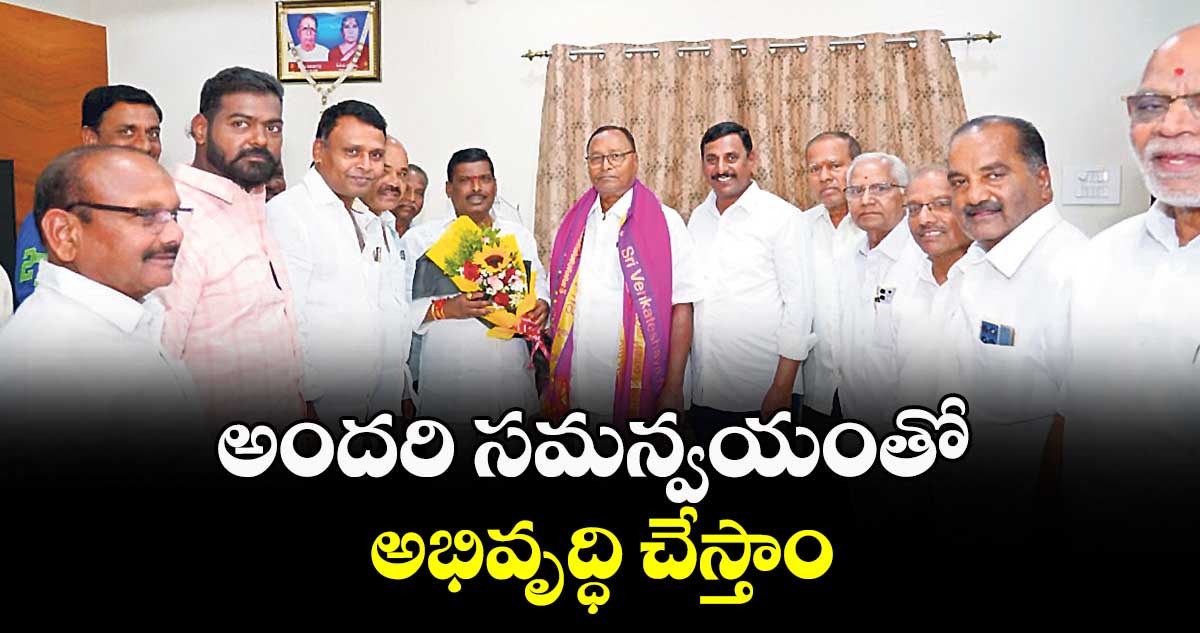 రామచంద్రాపురం, వెలుగు: పార్టీలకు అతీతంగా అందరి సమన్వయంతో కాలనీలను అభివృద్ధి చేస్తామని ఎమ్మెల్యే మహిపాల్ రెడ్డి హామీ ఇచ్చారు. రామచంద్రాపురం జీహెచ్ఎంసీ డివిజన్ పరిధిలోని కాలనీ వాసులు గురువారం ఎమ్మెల్యేను కలిశారు. ఇటీవల కాలనీ అధ్యక్షుడిగా ఎన్నికైన వెన్నవరం మల్లారెడ్డి ఆధ్వర్యంలో ఎమ్మెల్యేను సత్కరించి పలు అంశాలపై చర్చించారు.