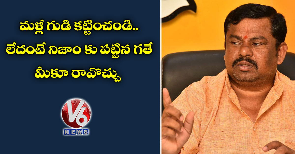 “కేసీఆర్ .. మీకు దేవుడి మీద నమ్మకం ఉందో నాకు తెలియదు. అప్పుడప్పుడు మొక్కులు తీర్చడం, యాగాలు చేయడం చేస్తుంటారు. అది కూడా ప్రజల కోసం కాదు.. మీ కోసమని అందరికి తెలుసు. గుళ్ళు పడగొట్టొద్దనీ, గుళ్ళు కూల్చి వేస్తే మనం సర్వ నాశనం అవుతామని పెద్దలు, మన పూర్వీకులు చెప్పేవారు. ఆ గుడి ప్లేస్ లోనే మళ్లీ గుడి కట్టించండి.. లేదంటే నిజాం కు పట్టిన పరిస్థితే మీకూ రావొచ్చు. ఆలోచన చేసుకోండి” అని అన్నారు.