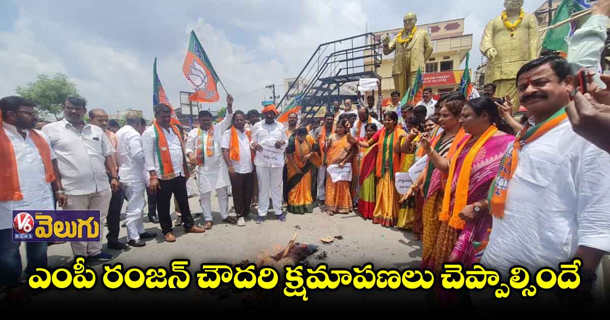 రాష్ట్రపతి ద్రౌపది ముర్ముకు పశ్చిమ బెంగాల్ ఎంపీ రంజన్ చౌదరి క్షమాపణ చెప్పాల్సిందేనని బీజేపీ రంగారెడ్డి జిల్లా అధ్యక్షులు సామ రంగారెడ్డి డిమాండ్ చేశారు. వెస్ట్ బెంగాల్ ఎంపీ, కాంగ్రెస్ పార్టీ ఫ్లోర్ లీడర్ అధిర్ రంజన్ చౌదరి చేసిన వ్యాఖ్యలను నిరసిస్తూ.. ఎల్బీ నగర్ లోని అంబేద్కర్ విగ్రహం వద్ద బీజేపీ రంగారెడ్డి జిల్లా అధ్యక్షుడు సామ రంగారెడ్డి ఆధ్వర్యంలో బీజేపీ నాయకులు ఆందోళనకు దిగారు. రోడ్డుపై బైఠాయించి ఎంపీ చేసిన వ్యాఖ్యలు వెనక్కు తీసుకోవాలని డిమాండ్ చేశారు. అనంతరం సోనియా గాంధీ దిష్టిబొమ్మను దహనం చేశారు. ఈసందర్భంగా సామ రంగారెడ్డి మాట్లాడుతూ...సోనియా గాంధీ, రాహుల్ గాంధీలపై ఈడీ విచారణ చేస్తున్న సమయంలో రంజన్ చౌదరి పార్లమెంట్ నుంచి సస్పెండ్ అయ్యారని తెలిపారు. అనంతరం ధర్నాలో కూర్చొని దేశ ప్రథమ పౌరురాలైన రాష్ట్రపతిపై అలాంటి కామెంట్ చేయడం సిగ్గు చేటన్నారు. రాష్ట్రపతి కాదు హిందుస్థాన్ రాష్ట్రపత్ని అనడం దారుణమన్నారు. వెంటనే అధిర్ రంజన్ చౌదరి క్షమాపణలు చెప్పాలని సామ రంగారెడ్డి కోరారు. కార్యక్రమంలో బీజేపీ కార్పొరేటర్లు రాష్ట్ర ఓబీసీ నాయకులు చింతల సురేందర్ యాదవ్, మహిళ నాయకులు పాల్గొన్నారు.