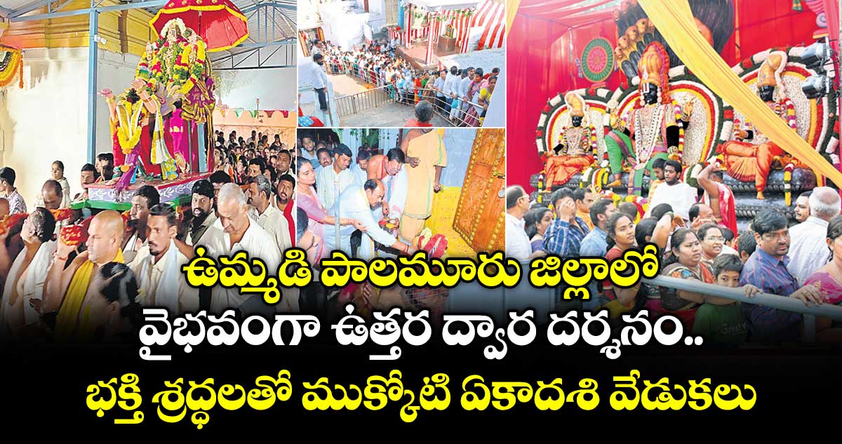 ముక్కోటి ఏకాదశి పర్వదినాన్ని భక్తులు ఘనంగా జరుపుకున్నారు. ఉమ్మడి పాలమూరు జిల్లావ్యాప్తంగా మంగళవారం తెల్లవారుజాము నుంచే వైష్ణవ దేవాలయాలకు భక్తులు క్యూ కట్టారు. ఉత్తర ద్వారం గుండా విష్ణు, వేంకటేశ్వర స్వామివార్లను దర్శించుకొని ప్రత్యేక పూజలు చేసి మొక్కులు చెల్లించుకున్నారు. మహబూబ్ నగర్ జిల్లాలో ప్రసిద్ధి చెందిన కురుమూర్తి, మన్నెంకొండ క్షేత్రాలు భక్తులతో కిక్కిరిసి పోయాయి. మహబూబ్ నగర్ నగరంలోని పిల్లల మర్రి రోడ్డులో ఉన్న వేంకటేశ్వరస్వామి ఆలయంలో ఉదయం నుంచే భక్తులు బారులుతీరారు.
