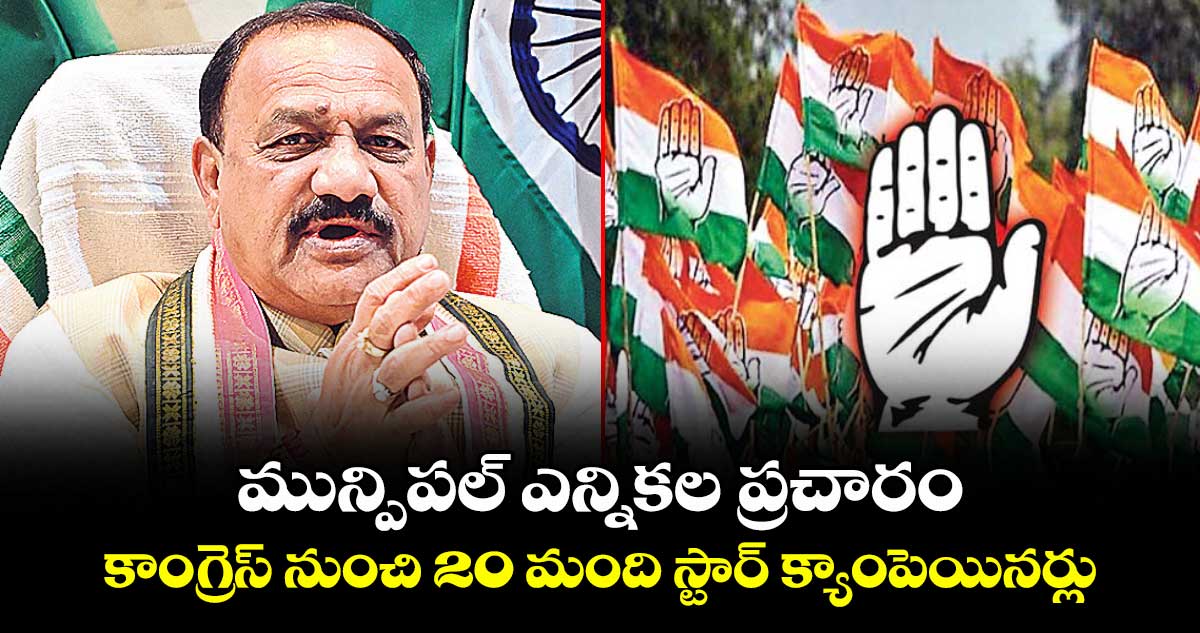 హైదరాబాద్, వెలుగు: మున్సిపల్ ఎన్నికల్లో భాగంగా కాంగ్రెస్ తరఫున ప్రచారం చేసేందుకు 20 మందితో కూడిన స్టార్ క్యాంపెయినర్ జాబితాను గురువారం రాష్ట్ర ఎన్నికల కమిషనర్ రాణి కుముదినికి పీసీసీ చీఫ్ మహేశ్ గౌడ్ అందించారు. ఇందులో సీఎం రేవంత్ రెడ్డి సహా 16 మంది కేబినెట్ మంత్రులు ఉన్నారు.