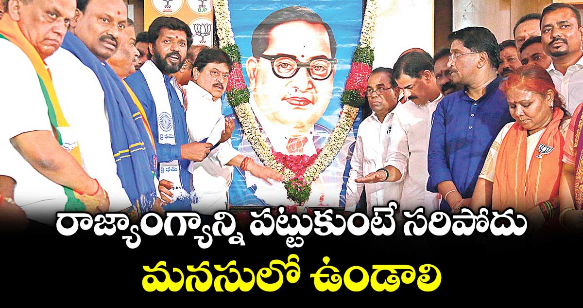 హైదరాబాద్, వెలుగు: రాహుల్ గాంధీ రాజ్యాంగ పుస్తకాన్ని చేతిలో పట్టుకొని తిరుగుతున్నారని, కానీ రాజ్యాంగాన్ని చేతిలో పట్టుకుంటే సరిపోదని దానిని మనసులో పెట్టుకొని ఆచరించాలని బీజేపీ స్టేట్ ప్రెసిడెంట్ ఎన్.రాంచందర్ రావు అన్నారు. మంగళవారం బీజేపీ స్టేట్ ఆఫీసులో అంబేద్కర్ చిత్రపటానికి పూలమాలలు వేసి నివాళులు అర్పించారు. అనంతరం అంబేద్కర్ కేవలం రాజ్యాంగ రచయిత మాత్రమే కాదని, సామాజిక న్యాయం కోసం పోరాడిన మహానుభావుడని రాంచందర్ రావు కొనియాడారు.