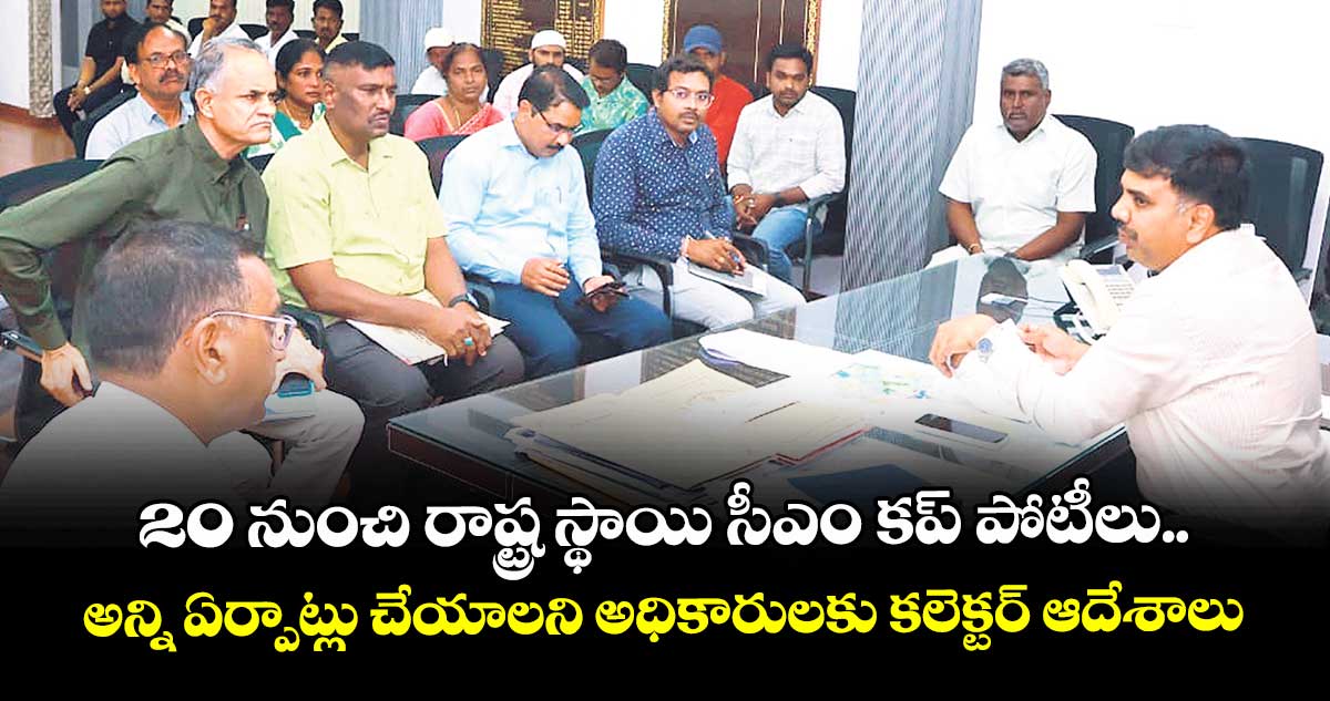 క్రీడాకారులకు వసతి, భోజనం, తాగునీరు, వైద్య సదుపాయాలు, భద్రతా ఏర్పాట్లు చేయాలని అధికారులను ఆదేశించారు. స్టేడియం ప్రాంగణంలో పరిశుభ్రత, లైటింగ్, తాత్కాలిక గ్యాలరీలు, పార్కింగ్, ట్రాఫిక్ నియంత్రణ, అంబులెన్స్ సేవలు సిద్ధంగా ఉంచాలన్నారు. వివిధ శాఖల మధ్య సమన్వయం ఉండాలని, ప్రతి విభాగం తమ బాధ్యతలను సమర్థవంతంగా నిర్వర్తించాలని సూచించారు. ఆర్డీఓ వై. అశోక్ రెడ్డి, డీఈఓ భిక్షపతి, డీఎస్వైఓ అక్బర్ అలీ, జడ్పీ సీఈవో శ్రీనివాసరావు ఉన్నారు.