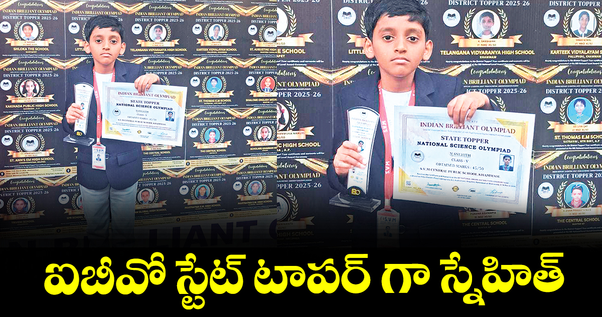 ఖమ్మం టౌన్, వెలుగు : ఇండియన్ బ్రిలియంట్ ఒలంపియాడ్ (ఐబీవో) స్టేట్ టాపర్ గా ఎస్ వీఎం సెంట్రల్ పబ్లిక్ స్కూల్ లో 4వ తరగతి చదువుతున్న నల్లి స్నేహిత్ నిలిచాడు. గత నెలలో ఐబీవో నిర్వహించిన నేషనల్ సైన్స్ ఒలంపియాడ్ కాంపిటేటివ్ పరీక్షల్లో స్టేట్ టాపర్ గా ఎంపికయ్యాడు.