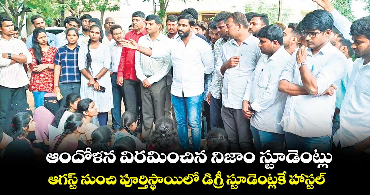 సీఎం రేవంత్రెడ్డి అమెరికా పర్యటనలో ఉన్నారని, రాగానే సమస్యపై చర్చించి న్యాయం చేస్తామని చెప్పారు. ఈలోపు ఓయూ వీసీతో మాట్లాడతామన్నారు. ప్రస్తుత పీజీ స్టూడెంట్ల అకడమిక్ఇయర్పూర్తయిన వెంటనే డిగ్రీ స్టూడెంట్లకు కాలేజీ హాస్టల్ను పూర్తిస్థాయిలో కేటాయిస్తామని హామీ ఇచ్చారు. రెండు రోజుల్లో ఆ మేరకు సర్క్యులర్విడుదల చేయిస్తామని హామీ ఇచ్చారు.