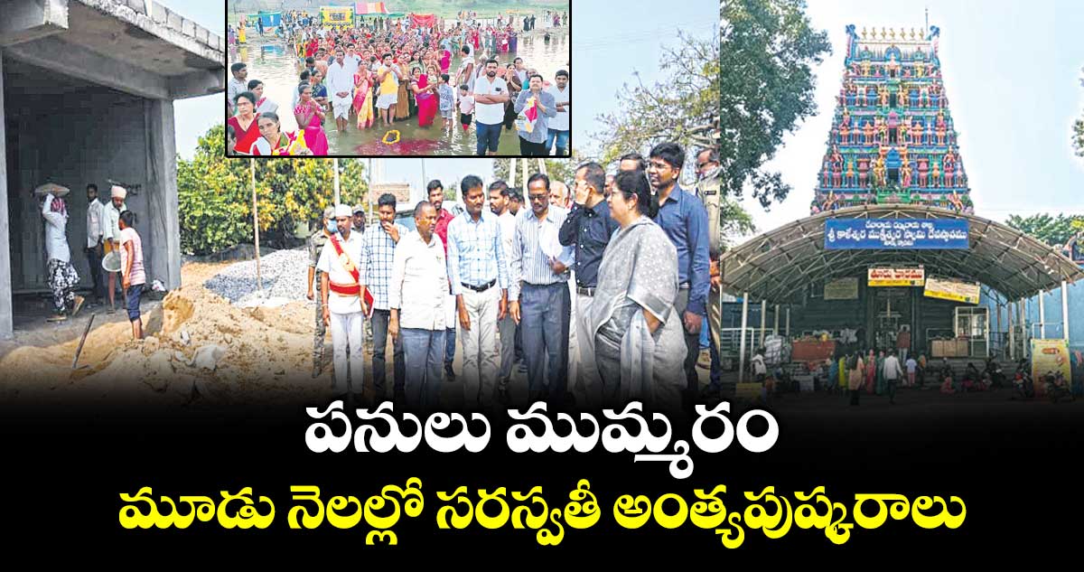 మే 21 నుంచి ప్రారంభమయ్యే సరస్వతీ అంత్యపుష్కరాలకు రాష్ట్ర ప్రభుత్వం రూ.30 కోట్లు కేటాయించింది. మూడు నెలల సమయం ఉండటంతో పకడ్బందీగా పనులు పూర్తయ్యేలా ఆఫీసర్లు చర్యలు తీసుకుంటున్నారు. ఈనెల 6న కాళేశ్వరంలో పర్యటించిన దేవదాయశాఖ ప్రిన్సిపల్ సెక్రటరీ శైలజరామయ్యర్ అభివృద్ధి పనుల ప్రపోజల్స్ రెడీ చేయాలని ఆఫీసర్లకు దిశానిర్దేశం చేశారు. కుదురుపల్లి– బీరసాగర్ రోడ్డు, సిరోంచ నుంచి గోదావరి ఘాట్ వరకు తాత్కాలిక రోడ్డు, వాహన పార్కింగ్ ఏర్పాటు, టెంట్ సిటీ, పార్కింగ్, సరస్వతీ ఘాట్, గోదావరి ఘాట్ల వద్ద జనరేటర్ల ఏర్పాటు, మ్యూజియం, విద్యుత్ దీపాలంకరణ, క్యూలైన్ల ఏర్పాటుకు ప్రతిపాదనలు రెడీ చేయాలని టెండర్లు పిలిచి పనులు ప్రారంభించాలని ఆదేశించారు.