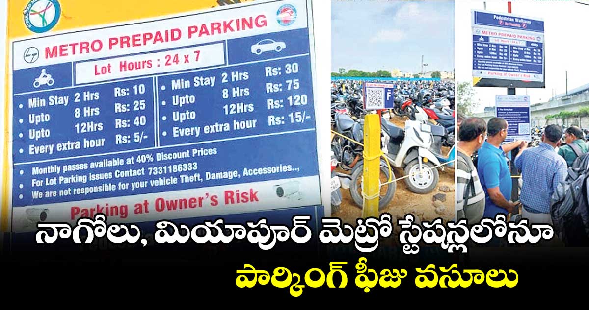 హైదరాబాద్, వెలుగు: నాగోలు, మియాపూర్ మెట్రో స్టేషన్లలో పార్కింగ్ఫీజు వసూలు చేయనున్నట్లు ఎల్అండ్ టీ, హెచ్ఎంఆర్ఎల్ అధికారులు ప్రకటించారు. ఇప్పటి వరకు ఈ స్టేషన్లలో ఫ్రీ పార్కింగ్ అమలులో ఉంది. త్వరలో ఫ్రీ పార్కింగ్ను ఎత్తివేయనున్నట్లు తెలిపారు. ఈ నెల 25 నుంచి నాగోలు మెట్రో స్టేషన్ లో, సెప్టెంబర్ ఒకటి నుంచి మియాపూర్ మెట్రో స్టేషన్ లో పార్కింగ్ ఫీజు అమలు చేయబోతున్నట్లు మెట్రో అధికారులు బుధవారం ప్రకటించారు.