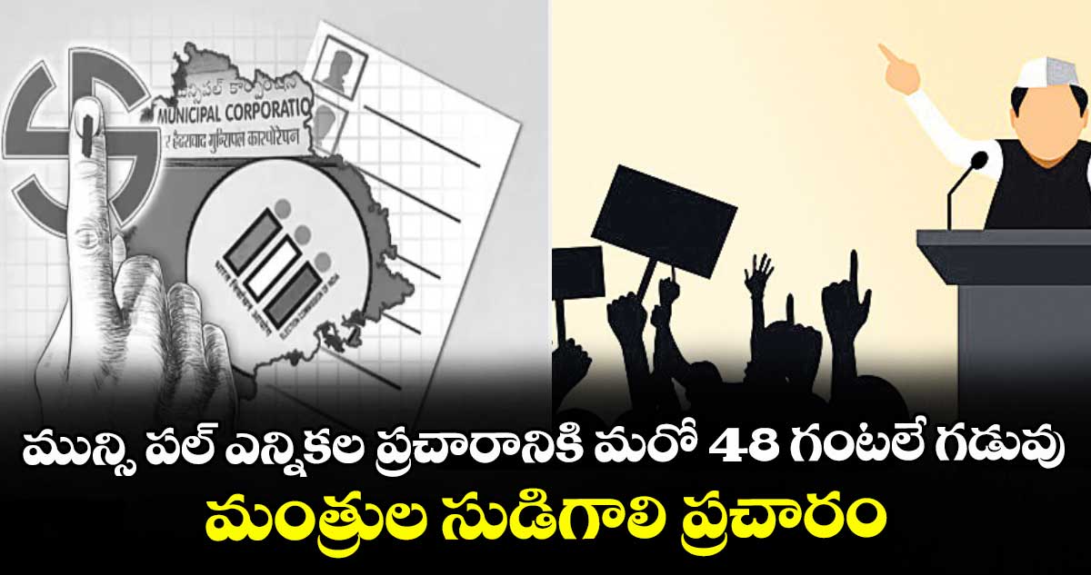హైదరాబాద్, వెలుగు: మున్సిపల్ ఎన్నికల ప్రచారానికి మరో 48 గంటల గడువు మాత్రమే మిగిలి ఉండడంతో రాష్ట్ర మంత్రులు సుడిగాలి ప్రచారం నిర్వహిస్తున్నారు. ఇటు తమ సొంత జిల్లాల్లోని మున్సిపాలిటీల్లో ప్రచారానికి రావాలని మంత్రులకు స్థానిక నేతల నుంచి తీవ్రమైన ఒత్తిళ్లు వస్తున్నాయి. ఇదే సమయంలో ఒక్కో మంత్రికి ఒక్కో పార్లమెంట్ నియోజకవర్గ ఇన్చార్జీ బాధ్యతలను కూడా సీఎం రేవంత్ రెడ్డి అప్పగించడంతో అక్కడి మున్సిపాలిటీల్లో ప్రచారానికి రావాలని లోకల్ లీడర్లు కోరుతున్నారు.