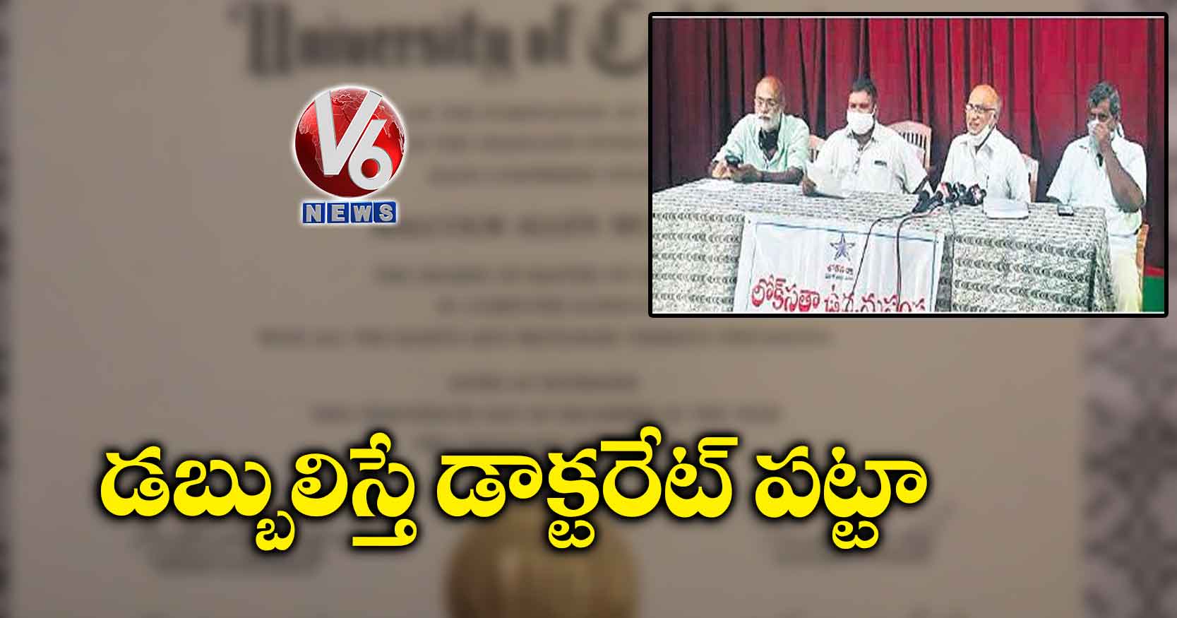 డాక్టరేట్ రావాలంటే చాలా కష్టపడాలి. ఏదైనా సబ్జెక్టులో పీజీ చేసి ఉండాలి. దాంట్లో ఓ అంశంపై కనీసం మూడేళ్లపాటు పరిశోధన చేయాలి. లేదా ఏదైనా రంగంలో అసామాన ప్రతిభ కనబర్చినా.. సామాజిక సేవా కార్యక్రమాలు చేసినా అలాంటి వారి గౌరవార్థం గుర్తింపు పొందిన యూనివర్సిటీలు గౌరవ డాక్టరేట్లు ఇస్తాయి. కానీ ఇవేవి లేకుండానే కొన్ని యూనివర్సిటీలు డబ్బులిస్తే డాక్టరేట్లు ప్రదానం చేస్తున్నాయి. ఇలాంటి డాక్టరేట్ల బాగోతాన్ని లోక్సత్తా వెలుగులోకి తెచ్చింది.