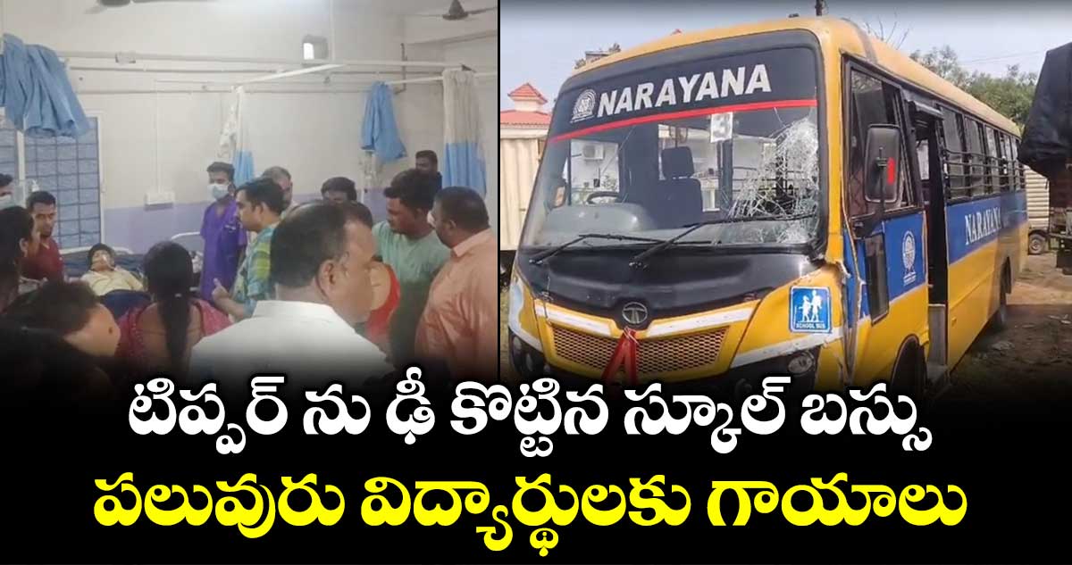 రంగారెడ్డి జిల్లా శంకర్ పల్లి మోకిలా దగ్గర స్కూల్ బస్సు టిప్పర్ ను ఢీ కొట్టింది. మోకిలా నుంచి శంకర్ పల్లి వస్తుండగా లక్ష్మీనరసింహస్వామి ఆలయం దగ్గర స్పీడ్ బ్రేకర్ల దగ్గర ముందున్న టిప్పర్ ను ఢీ కొట్టింది బస్సు.