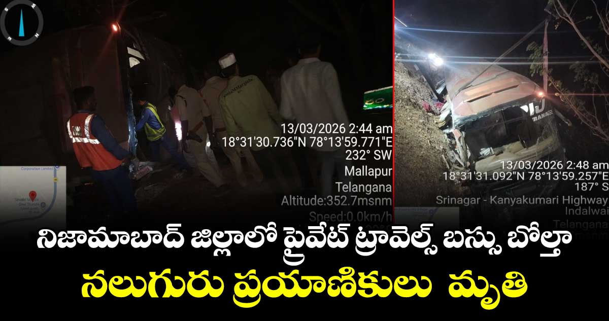 నిజామాబాద్ జిల్లాలో జాతీయ రహదారిపై ఘోర రోడ్డు ప్రమాదం జరిగింది.అర్థరాత్రి 2 గంటలకు ఇందల్వాయి,గన్నారం మధ్యలో అదుపు తప్పి ప్రైవేట్ ట్రావెల్ బస్సు బోల్తా పడింది. ఈ ప్రమాదంలో నలుగురు మృతి చెందగా..తీవ్రగాయాలైన మరొకరి పరిస్థితి విషమంగా ఉంది.