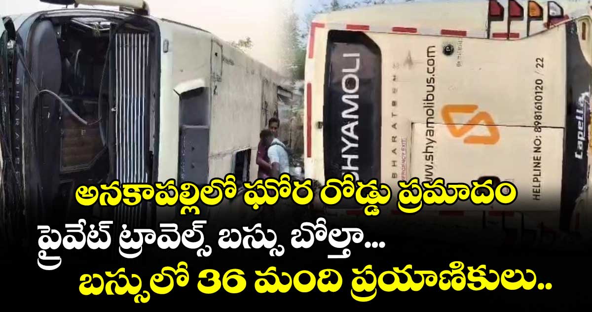 ఏపీలోని అనకాపల్లిలో ఘోర రోడ్డు ప్రమాదం జరిగింది. ప్రైవేట్ ట్రావెల్స్ బస్సు బోల్తా పడటంతో 12 మందికి తీవ్ర గాయాలయ్యాయి. ఆదివారం ( ఏప్రిల్ 19 ) జరిగిన ఈ ఘటనకు సంబంధించి వివరాలిలా ఉన్నాయి... అనకాపల్లిలోని నక్కపల్లి జాతీయరహదారి దగ్గర ప్రైవేట్ ట్రావెల్స్ బస్సు బోల్తా పడింది. ఈ ఘటనలో 12 మందికి తీవ్ర గాయాలైనట్లు సమాచారం.