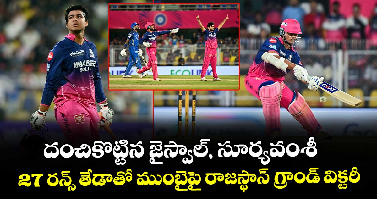 గువాహతి: ఐపీఎల్ 19వ సీజన్లో రాజస్తాన్ రాయల్స్ హవా కొనసాగుతోంది. మెగా టోర్నీలో వరుసగా మూడో మ్యాచ్లోనూ రాయల్స్ విజయం అందుకుంది. మంగళవారం వర్షం అంతరాయం కలిగించిన పోరులో యశస్వి జైస్వాల్ (32 బాల్స్లో 40 ఫోర్లు, 4 సిక్సర్లతో 77 నాటౌట్) ఆకాశమే హద్దుగా చెలరేగడంతో ఆర్ఆర్ 27 రన్స్ తేడాతో ముంబై ఇండియన్స్ను ఓడించింది. ఆడిన మూడు మ్యాచ్ల్లోనూ గెలిచి పాయింట్ల పట్టికలో టాప్ ప్లేస్కు చేరుకుంది. 11 ఓవర్లకు కుదించిన ఈ మ్యాచ్లో టాస్ ఓడి తొలుత బ్యాటింగ్కు వచ్చిన రాజస్తాన్ 150/3 స్కోరు చేసింది.