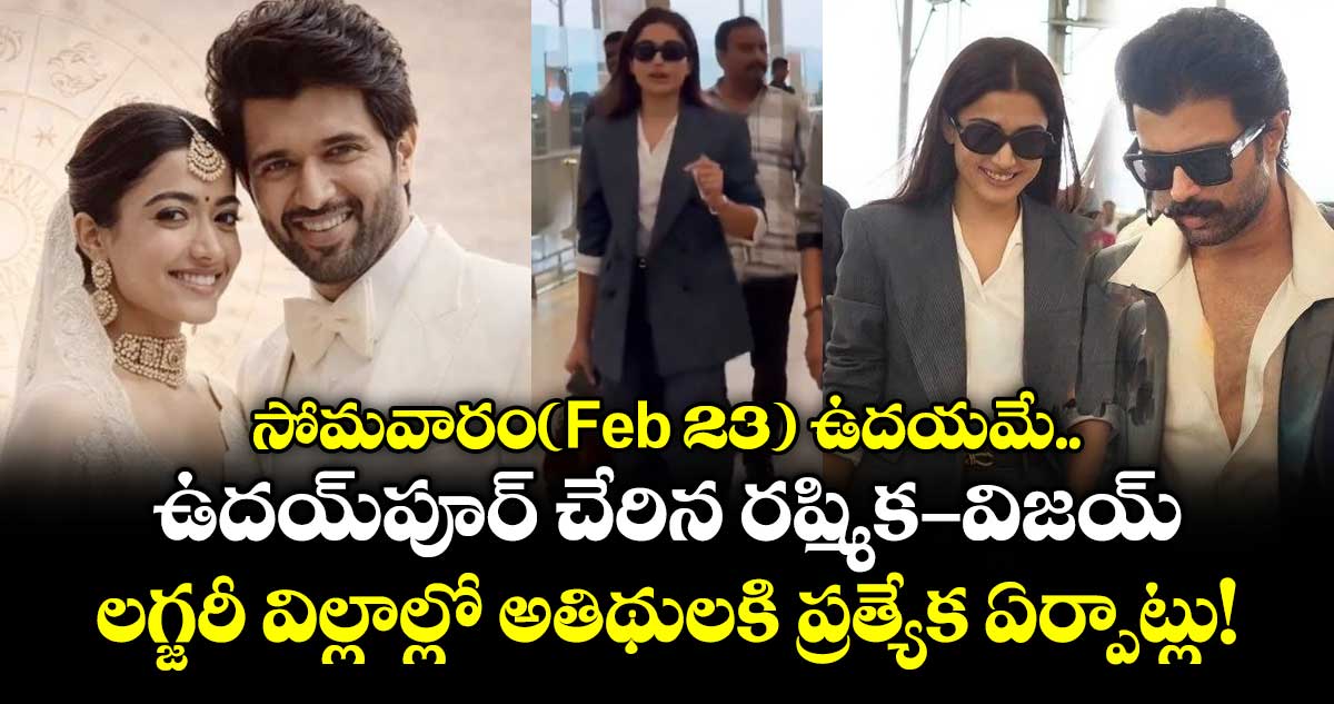 రష్మిక మందన్న, విజయ్ దేవరకొండతో పాటుగా దాదాపు 50 మంది అతిధులతో ఇవాళ (ఫిబ్రవరి 23న) ఉదయం ఉదయపూర్ విమానాశ్రయంలో దిగారు. రాజస్థాన్లోని సిటీ ఆఫ్ లేక్స్లో మూడు రోజుల పాటు జరిగే వివాహా వేడుకలో పెద్దగా సినీ తారలు హాజరు కానప్పటికీ, తెలంగాణకు చెందిన కొంతమంది రాజకీయ ప్రముఖులు, కొందరు సినీ దర్శకులు పాల్గొననున్నట్లు సమాచారం. మొత్తం ఆహ్వానితుల సంఖ్య దాదాపు 100 మందికి పరిమితమయ్యే అవకాశముందని టాక్.