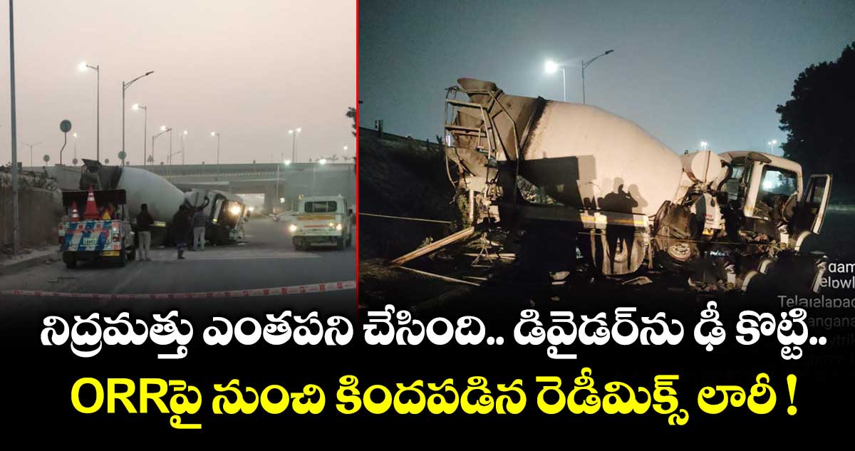 హైదరాబాద్: గ్రేటర్ హైదరాబాద్ పరిధిలోని కోకాపేట్ నియో పోలీస్ ఔటర్ రింగు రోడ్డుపై రెడీమిక్స్ లారీ బీభత్సం సృష్టించింది. డివైడర్ను ఢీ కొట్టి అదుపు తప్పి ఔటర్పై నుంచి రెడీమిక్స్ కాంక్రీట్ లారీ కిందపడింది. సర్వీస్ రోడ్డుపై ఎవరూ లేకపోవడంతో పెను ప్రమాదం తప్పింది. లారీ డ్రైవర్కు తీవ్ర గాయాలు కావడంతో అతనిని హుటాహుటిన ఆసుపత్రికి తరలించారు. మితిమీరిన వేగం, డ్రైవర్ నిద్రమత్తు కారణంగా ఈ ప్రమాదం జరిగినట్లు సమాచారం.