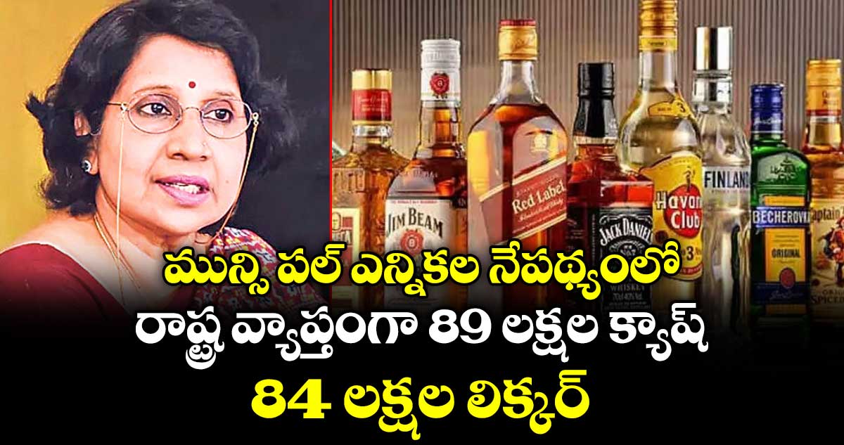 హైదరాబాద్, వెలుగు: మున్సిపల్ఎన్నికల నేపథ్యంలో రాష్ట్ర వ్యాప్తంగా రూ.89 లక్షల క్యాష్, రూ.84 లక్షల విలువైన లిక్కర్సీజ్ చేసినట్టు రాష్ట్ర ఎన్నికల సంఘం కమిషనర్ రాణి కుముదిని శనివారం ప్రకటించారు. రూ.13.27 లక్షల విలువ చేసే డ్రగ్స్, ఇతర మత్తు పదార్థాలు, రూ.78 వేల విలువ చేసే ట్యా బ్స్కూడా సీజ్చేశామని తెలిపారు.