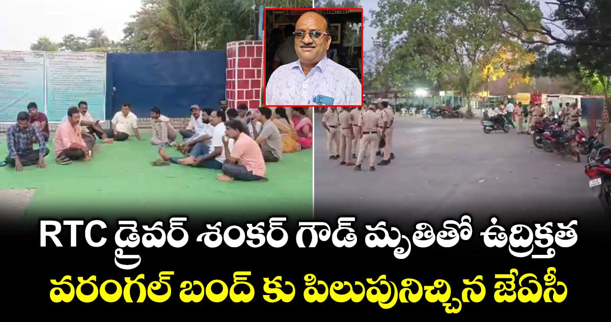 పెట్రోల్ పోసుకొని నిప్పంటించుకున్న నర్సంపేట ఆర్టీసీ డ్రైవర్ శంకర్ గౌడ్ మృతితో వరంగల్ జిల్లాలో ఉద్రిక్త పరిస్థితులు నెలకొన్నాయి.వరంగల్ జిల్లా బంద్ కు పిలుపునిచ్చారు ఆర్టీసీ జేఏసీ నేతలు. హనుమకొండ లో RTC డిపో ముందు RTC కార్మికులు, BRS శ్రేణులు ధర్నాకు దిగారు. బంద్ సందర్భంగా ఎలాంటి అవాంఛనీయ ఘటనలు జరగకుండా ముందస్తుంగా భారీగా పోలీసులు మోహరించారు. పోస్ట్ మార్టమ్ అనంతరం మృతిచెందిన ఆర్టీసీ డ్రైవర్ శంకర్ గౌడ్ మృతదేహాన్ని ఆయన స్వగ్రామం నర్సంపేటకు తరలించారు. ఇవాళ (శుక్రవారం, ఏప్రిల్24) నర్సంపేటలో నిర్వహించే అంత్యక్రియల్లో ఉమ్మడి వరంగల్ జిల్లాలోని RTC కార్మికులతో పాటు, రాష్ట్ర JAC నాయకులు అంతిమ సంస్కారాలలో పాల్గొననున్నారు.
