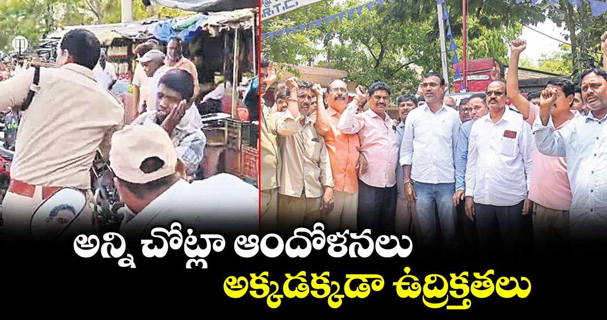 వెలుగు నెట్వర్క్, వెలుగు: ఆర్టీసీ కార్మికులు చేపట్టిన ఆందోళనలు మొదటి రోజైన బుధవారం కొన్ని చోట్ల ఉద్రిక్తతలకు దారి తీశాయి. డిపోల ఎదుట ఆందోళనలు చేస్తూ బస్సులను బయటకు రానివ్వకపోవడంతో పోలీసులు జోక్యం చేసుకోవలసి వచ్చింది. అడ్డుపడుతున్న కార్మికులకు పక్కకు తొలగించే క్రమంలో తోపులాటలు చోటుచేసుకున్నాయి. ఈ క్రమంలో పలువురిని అరెస్ట్చేసి పోలీస్స్టేషన్లకు తరలించారు.