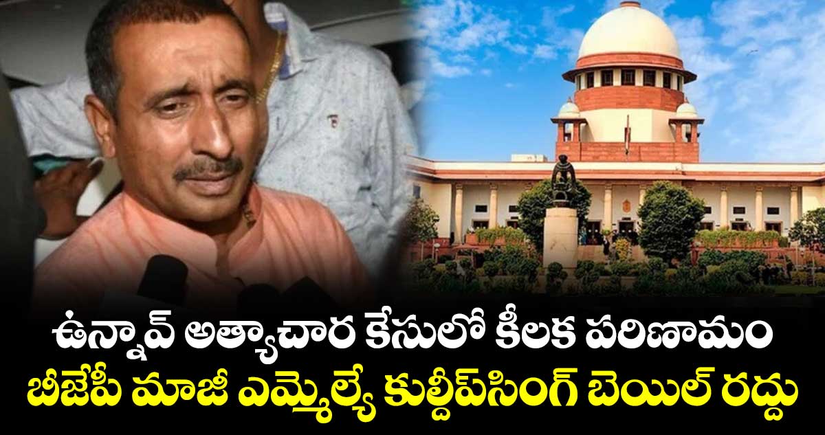 న్యూఢిల్లీ: ఉన్నావ్ అత్యాచార కేసులో కీలక పరిణామం చోటు చేసుకుంది. ఈ కేసులో ప్రధాన నిందితుడు, బీజేపీ మాజీ ఎమ్మెల్యే కుల్దీప్సెంగర్ శిక్షను సమర్ధిస్తూ, బెయిల్ రద్దు చేసింది సుప్రీం కోర్టు. కుల్దీప్సెంగర్ శిక్షను నిలిపివేయడంతో పాటు, బెయిల్ మంజురూ చేస్తూ ఢిల్లీ హైకోర్టు ఇచ్చిన ఉత్తర్వులపై దేశ సర్వోన్నత న్యాయస్థానం స్టే విధించింది. అనంతరం కుల్దీప్ సెంగర్కు సుప్రీం కోర్టు నోటీసులు జారీ చేసింది. నాలుగు వారాల్లోగా కౌంటర్ దాఖలు చేయాలని ఆదేశించింది.