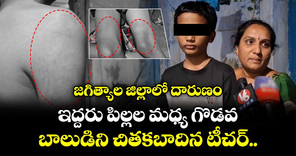 జగిత్యాల జిల్లాలో దారుణం జరిగింది. స్కూల్లో ఇద్దరు పిల్లల మధ్య గొడవ కారణంగా ఓ బాలుడిని చితకబాదింది ఓ టీచర్. మంగళవారం ( మార్చి 10 ) జరిగిన ఈ ఘటనకు సంబంధించి వివరాలిలా ఉన్నాయి... జగిత్యాల జిల్లాలోని కోరుట్ల పట్టణంలోని గౌతమ్ మోడల్ స్కూల్లో ఐదో తరగతి చదువుతున్న సాత్విక్ అనే బాలుడిని చితకబాదింది లేడీ టీచర్. స్కూల్లో ఇద్దరు పిల్లలతో సాత్విక్ గొడవపడ్డాడన్న కారణంతో దారుణంగా చితకబాదింది టీచర్.