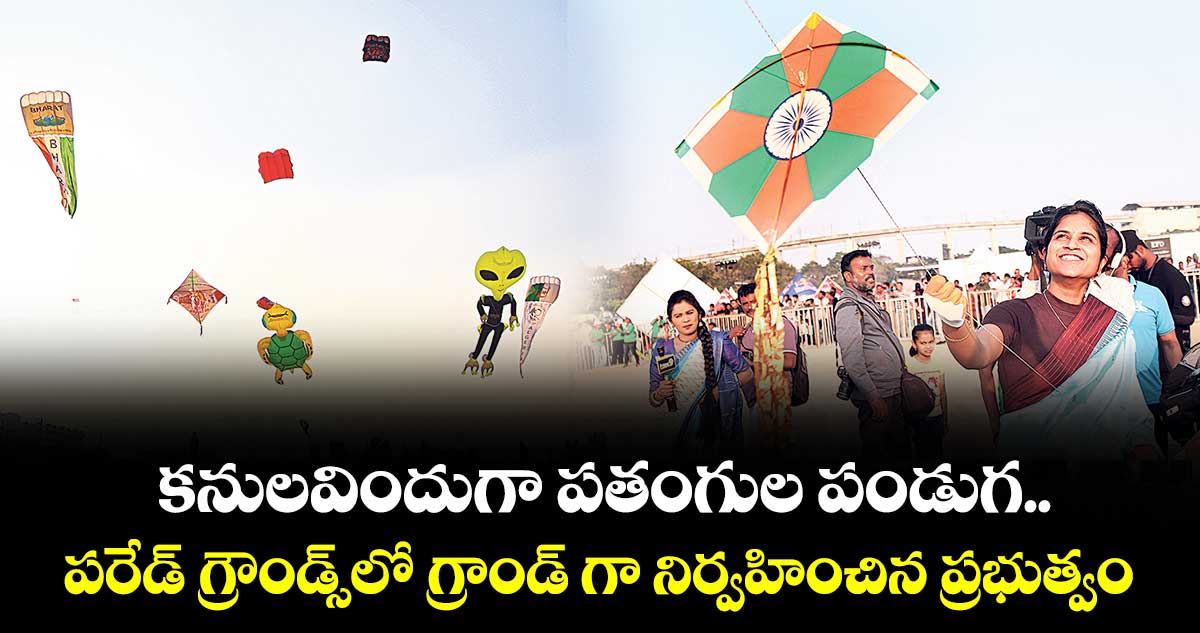 సికింద్రాబాద్లోని పరేడ్ గ్రౌండ్స్లో జాతీయ స్థాయి పతంగుల పండుగను తెలంగాణ ప్రభుత్వం గ్రాండ్గా నిర్వహించింది. టూరిస్ట్ శాఖ ఆధ్వర్యంలో మూడు రోజుల పాటు జరుగనున్న కైట్ ఫెస్టివల్ను మంగళవారం మంత్రులు జూపల్లి కృష్ణారావు, పొన్నం ప్రభాకర్ ప్రారంభించారు. తీరొక్క పతంగులతో పరేడ్ గ్రౌండ్ కలర్ఫుల్గా కనిపించింది. వివిధ ఆకారాలతో ఏర్పాటు చేసిన భారీ పతంగులు కనువిందు చేశాయి.